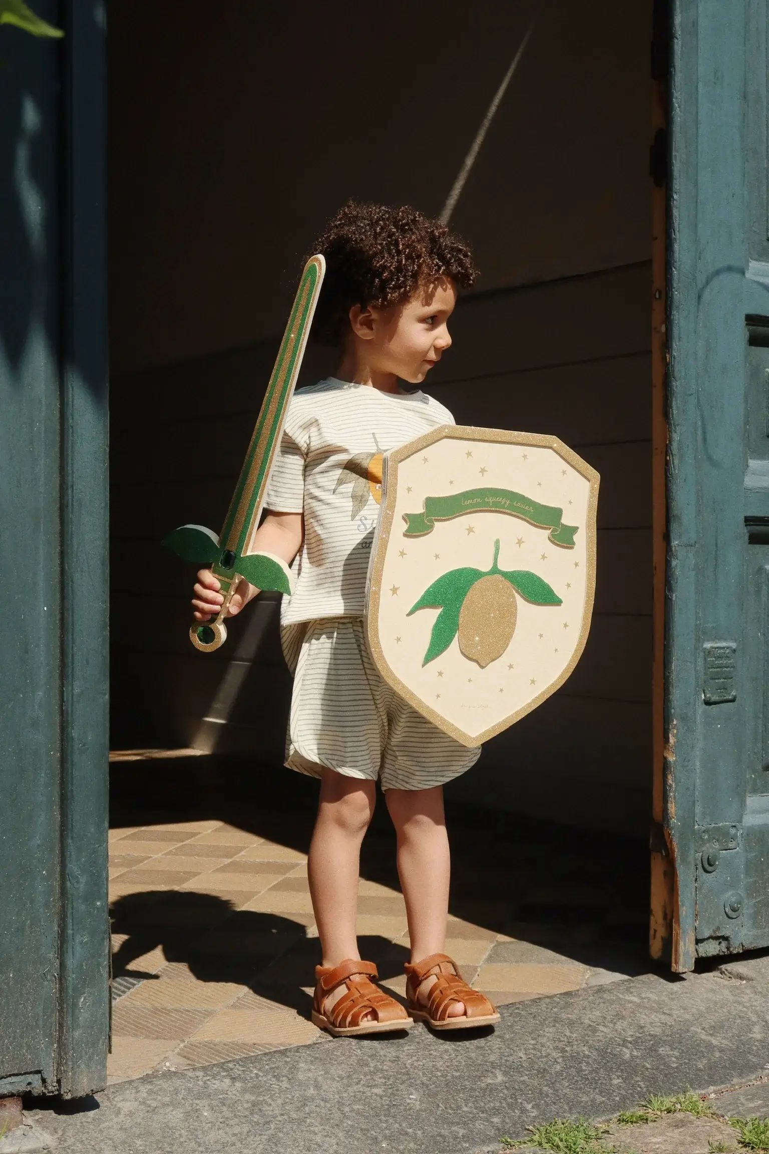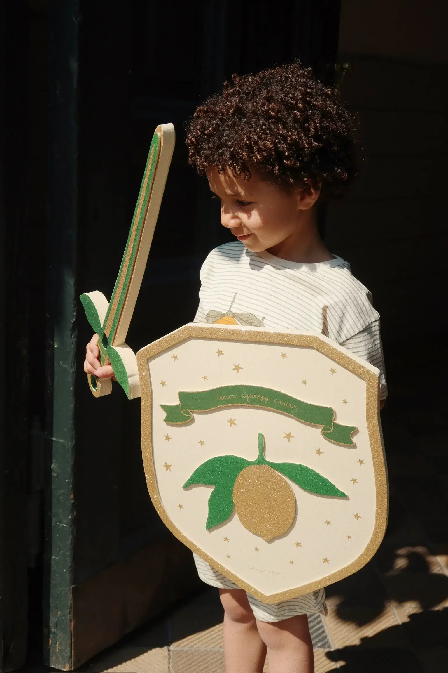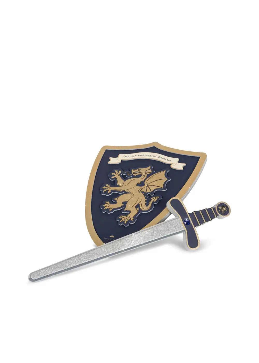 Miecz i tarcza wykonane z miękkiej i gąbczastej pianki EVA. Idealnie pasują do naszych kostiumów rycerza i księżniczki, tworząc doskonałe dopasowanie.