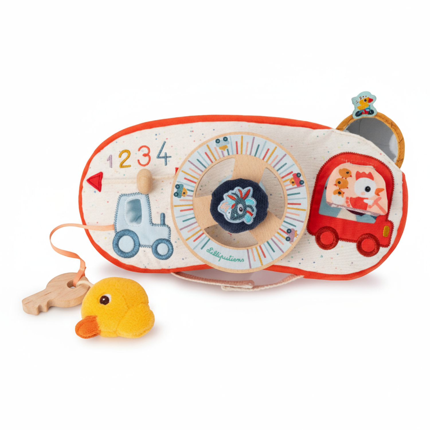 Zabawka idealna np. podczas podróży czy długiego spaceru, ponadto posiada pasek na rzep pozwalający zamocować ją w dowolnym miejscu. Tablica oferuje wiele opcji, m.in.: obracaną drewnianą kierownicę z miękkim klaksonem, drewniany kluczyk na sznureczku z breloczkiem-piszczałką w kształcie kaczorka, traktor-„stacyjkę”, w której można ten kluczyk umieścić, drewniany krążek przesuwany na sznureczku (znad nim znajdują się haftowane cyferki od 1 do 4, idealne do nauki liczenia), bezpieczne i miękkie boczne lusterko, a także autko-naszywkę z możliwością wymiany jego kierowców (ilustracje z postaciami z Farmy mają formę miękkiej mini-książeczki). Zabawka jest solidnie wykonana i w pełni bezpieczna. Zaskakuje i pobudza dziecięcą wyobraźnię. Rozwija koordynację ręka-oko, małą motorykę (chwytanie, potrząsanie, wkładanie, wyjmowanie, przesuwanie, obracanie), aktywizuje zmysł słuchu (szelest, piszczenie), dotyku (różne materiały i faktury, odstające elementy) i wzroku (lusterko).