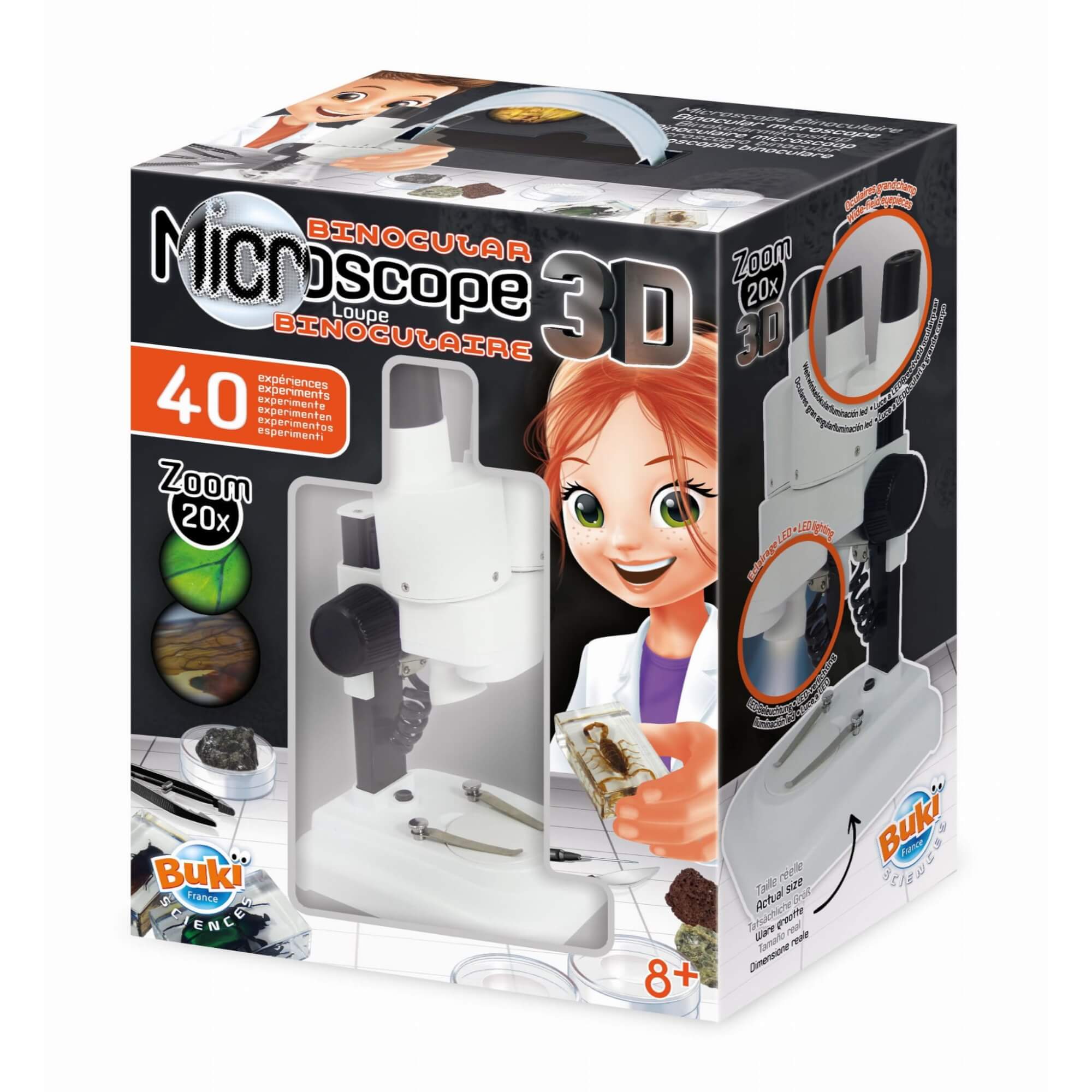 Podstawa z metalu, baterie (2xAA) nie są załączone. Mikroskop posiada wbudowane podświetlenie LED. Zestaw zawiera 3 próbki owadów oraz 3 rodzaje skał do obserwacji.