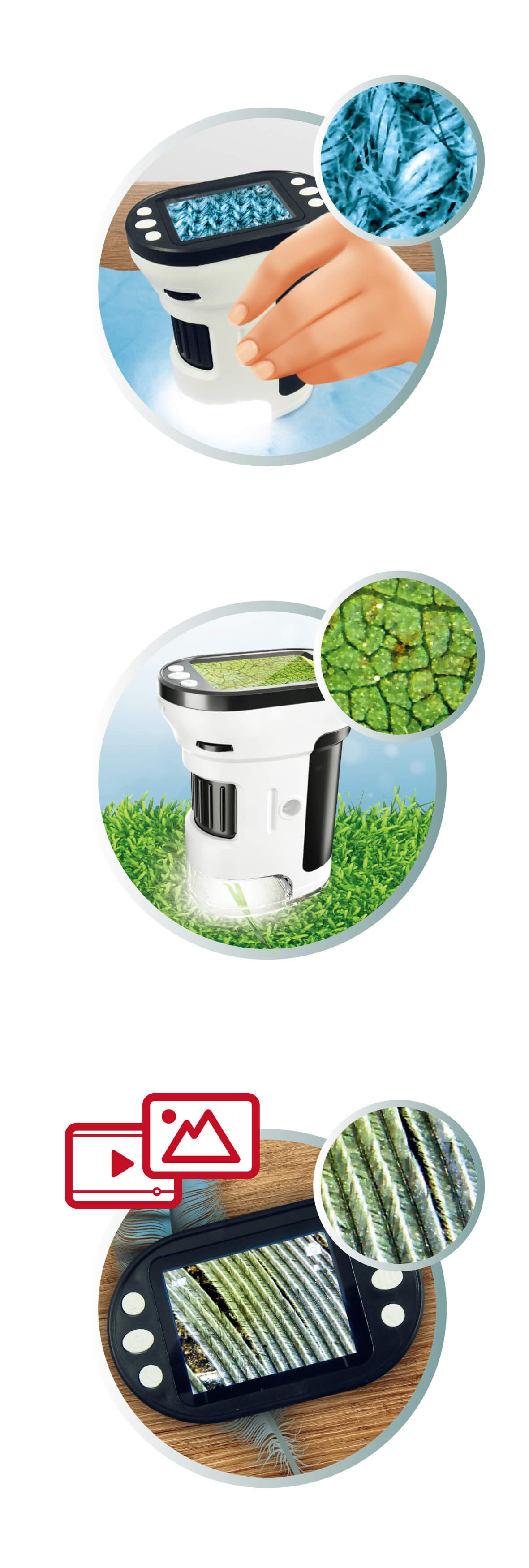 Dzięki regulowanemu powiększeniu od 200x do 1000x, Mikroskop Video MR350 pozwala dostrzec niewidzialne golym okiem struktury. Odkryj bogactwo detali w liściach, mchu, piasku, tkaninach, owadach i wielu innych obiektach – wystarczy jedno spojrzenie, aby świat nabrał zupełnie nowego znaczenia.
