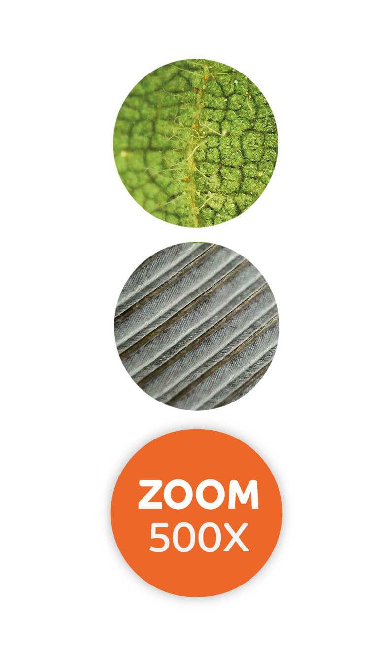 - Potężne Powiększenie 500x: Obserwuj niewidoczne gołym okiem detale - od struktury liścia po skomplikowany wzór owada. To powiększenie pozwala dostrzec fascynujące szczegóły.