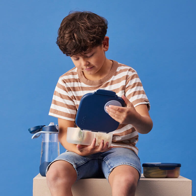 Mini lunchbox b.box dla dzieci ma dwie szczelne przegródki w tym jedną flex przeznaczoną na całe owoce