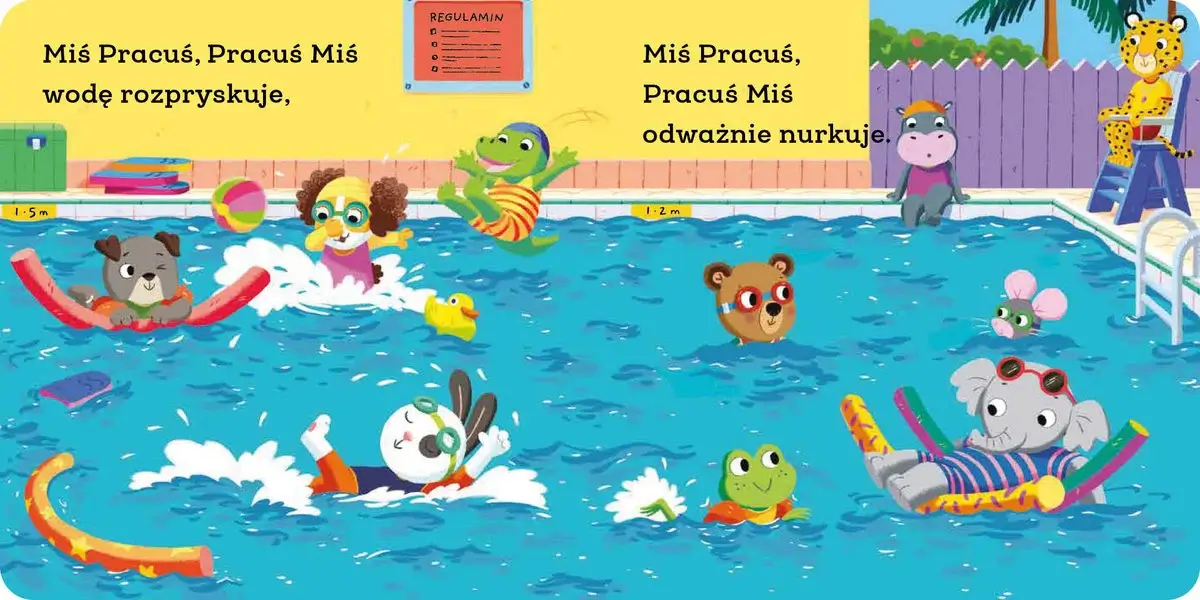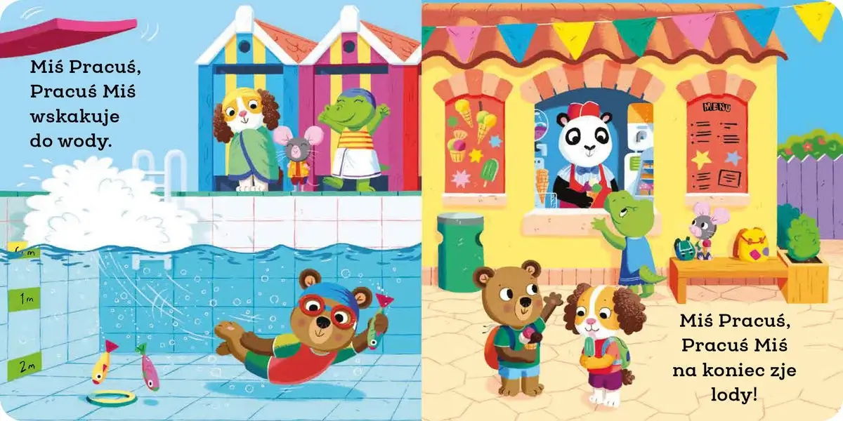 Miś Pracuś ma przed sobą kolejne ekscytujące zadanie – tym razem idzie na basen i uczy się pływać (a nawet nurkować). Na koniec ciekawego dnia zjada pyszne lody. To idealna książka dla każdego miłośnika zabawy w wodzie.