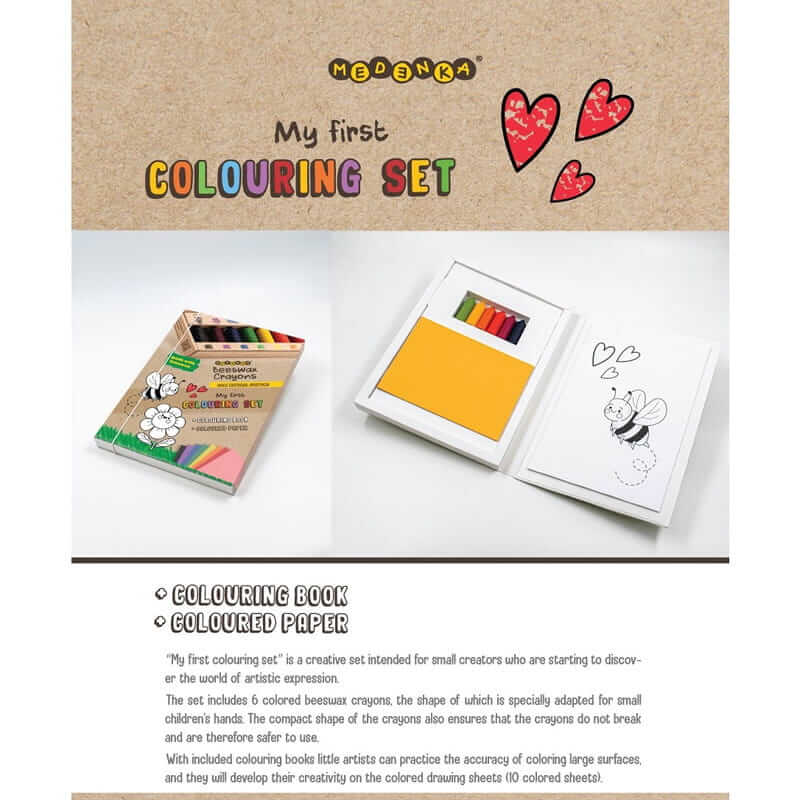 Zawiera 100% naturalne kredki z wosku pszczelego - naturalne kredki dla dzieci Medenka JUNIOR są krótsze i znacznie grubsze niż zwykłe akcesoria tego typu – ich grubość to 2 cm. Powstają ręcznie z wosku pszczelego w uroczym kraju – zielonej Słowenii – znanej jako ojczyzna pszczelarzy i pszczelarstwa. Ich atrakcyjne opakowanie sprawia, że to świetna propozycja na prezent już dla rocznego dziecka. Wymiary opakowania to 25 x 33 x 3 cm.