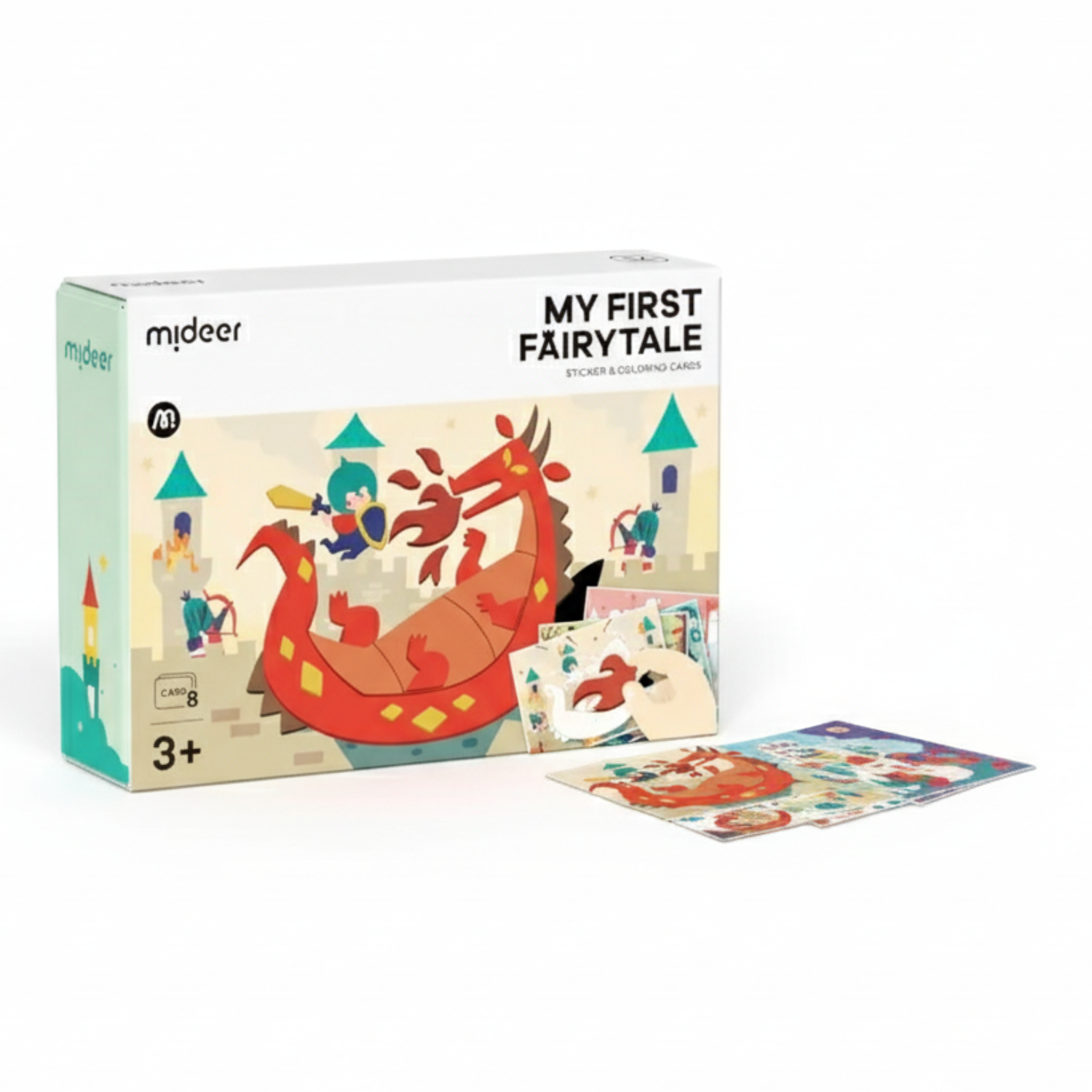 Zestaw zawiera: 54 naklejki samoprzylepne, 8 dużych tekturowych scen z bajek, 8 małych kart