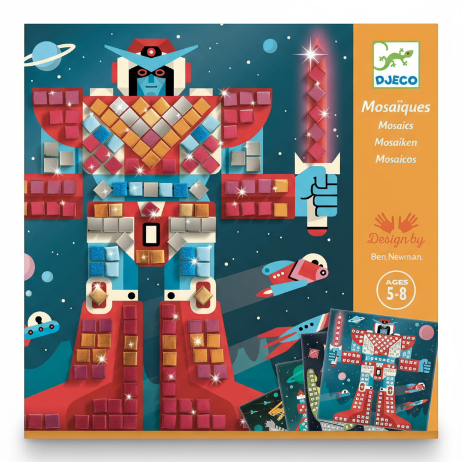 Zawartość: 4 ilustrowane szablony, 12 plansz z piankowymi błyszczącymi mozaikami, instrukcja obrazkowa „krok po kroku”