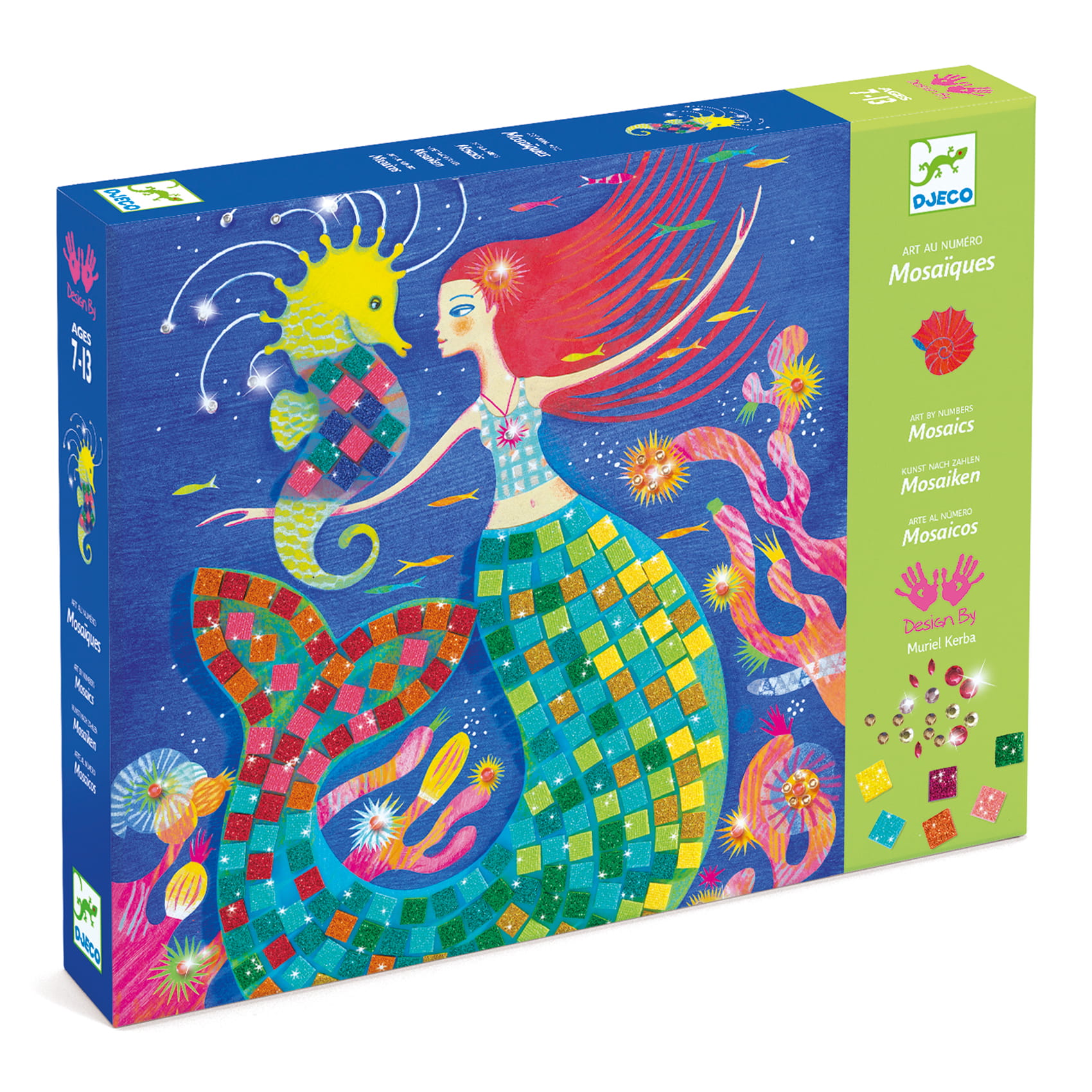 Na podstawie podanych numerów widocznych na ilustracji dziecko przykleja samoprzylepne piankowe, kolorowe błyszczące kwadraty i cyrkonie tworząc piękne obrazy syren w morskich przestworzach.