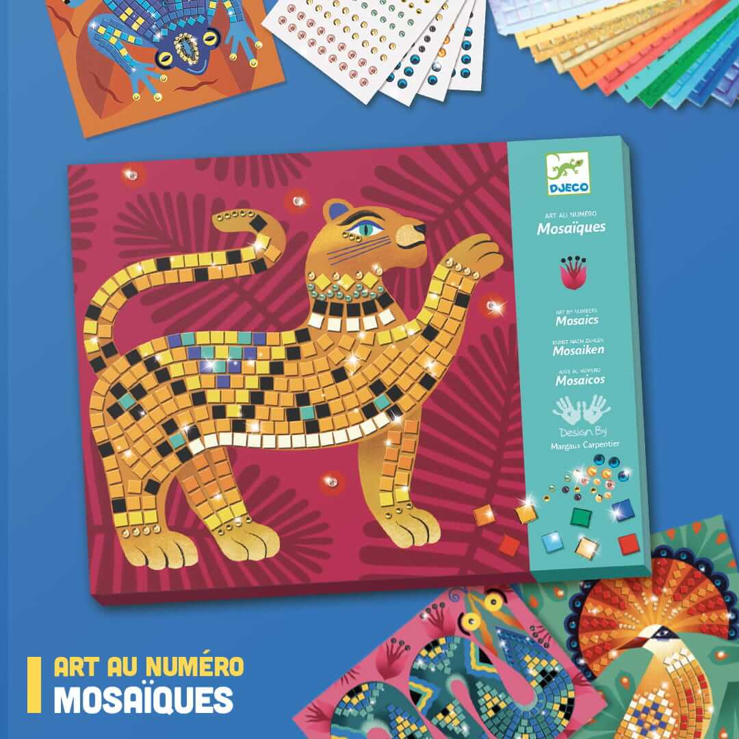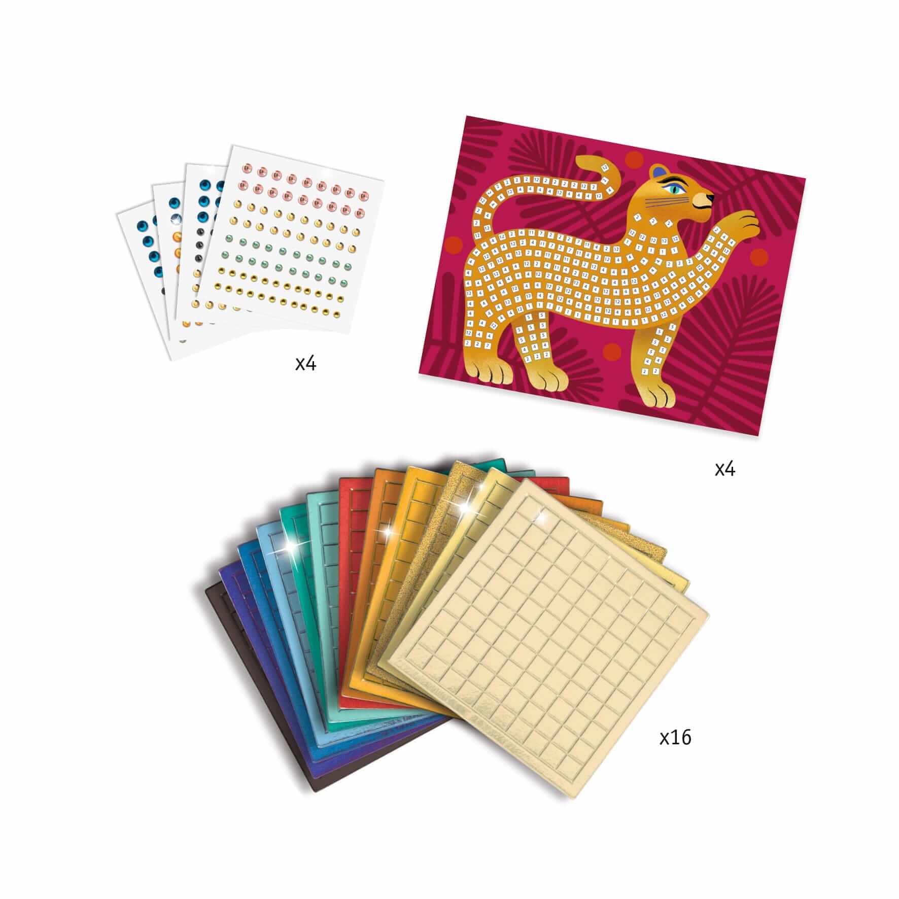 Na podstawie podanych numerów widocznych na ilustracji dziecko przykleja samoprzylepne piankowe, kolorowe błyszczące kwadraty i cyrkonie tworząc piękne obrazy zwierząt w dżungli.