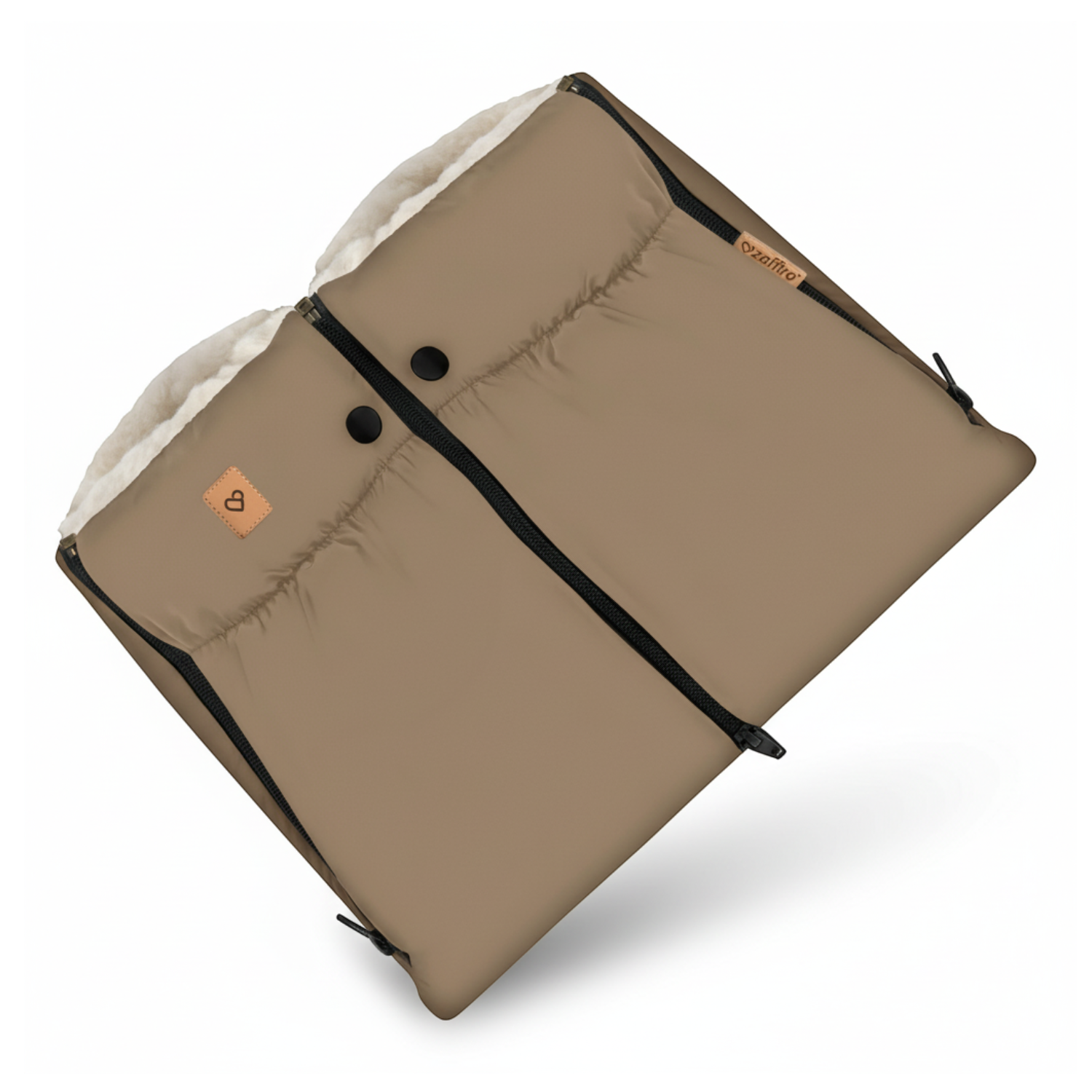 Mufka składa się z dwóch części, które możesz połączyć w jedną klasyczną mufkę lub rozdzielić na dwie osobne rękawice – dzięki temu dopasujesz ją do rodzaju wózka i własnych potrzeb. Idealna zarówno do rączki wózka pojedynczego, jak i podwójnego, a także dla osób, które wolą niezależne rękawice. Zapinana jest na zamek oraz na napy, co zapewnia stabilne mocowanie do wózka oraz szybkie i wygodne zakładanie. Zewnętrzna warstwa chroni przed wiatrem i wilgocią, a wewnętrzna owcza wełna premium gwarantuje naturalne ciepło.