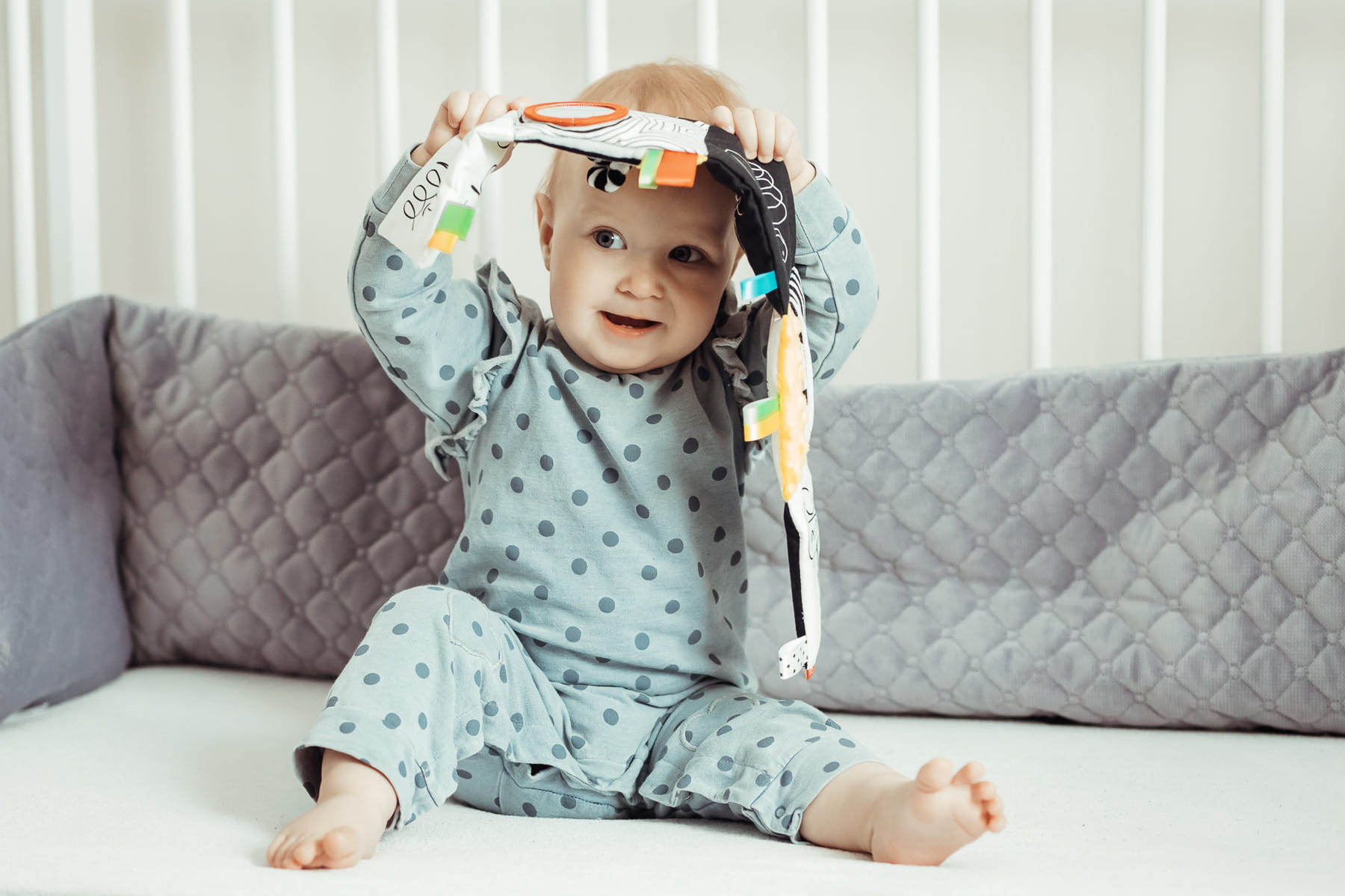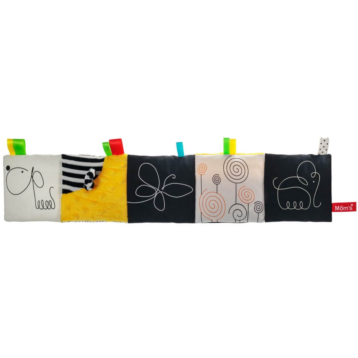 Biało-czarne kolory wzbudzają zainteresowanie dziecka oraz przyciągają uwagę. Dopełnieniem tego wyjątkowego artykułu jest żółty design, jak również elementy, które nasi najmłodsi uwielbiają najbardziej: szeleszczące strony, wstążeczki, lusterko, zawieszka, czy też elastyczne ogonki idealne to pociągania.
