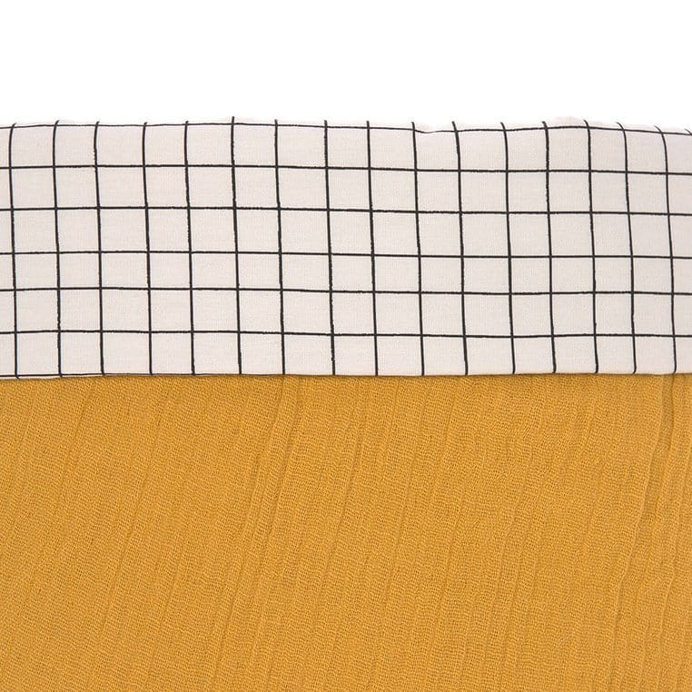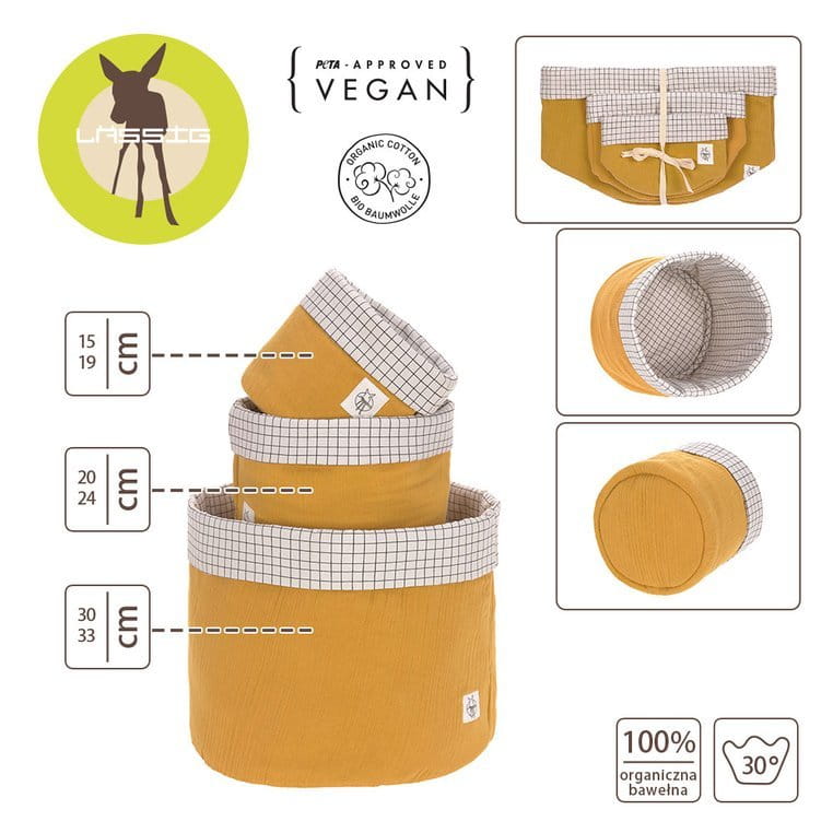 Kosze pomagają zachować porządek nie tylko w dziecięcych skarbach, akcesoriach i zabawkach, ale także np. w łazience, salonie czy kuchni. Zestaw składa się z trzech dwustronnych koszyków różnej wielkości, wzmocnionych od spodu i po bokach, dzięki czemu są stabilne, a przy tym – jeśli są puste – w razie konieczności można je złożyć na płasko lub włożyć jeden w drugi i przechowywać na małej przestrzeni. Kosze zostały wykonane z muślinu (strona musztardowa) i perkalu (strona biała w delikatną czarną kratkę), są wytrzymałe i łatwe w pielęgnacji – można je prać w pralce w temperaturze 30°C w delikatnym cyklu.