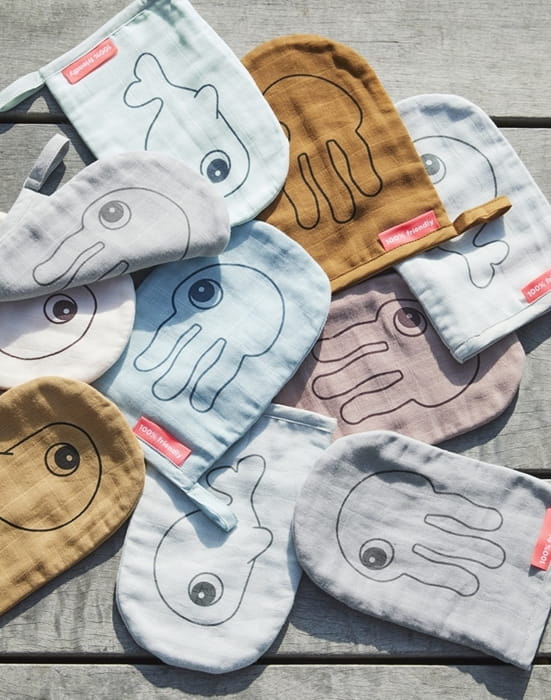 Zestaw w pasujących do siebie kolorach ozdobionych motywem znanych już morskich przyjaciół Done by Deer. Kąpiel z przyjaciółmi o wdzięcznych imionach Jelly i Wally powinna być pełna zabawy, pluskania i uśmiechu. Myjka dla niemowląt chroni delikatne ciałko, dzięki przyjemnemu miękkiemu muślinowi. Użyj materiałowej myjki do ochrony oczek podczas mycia głowy. Specjalna pętelka umożliwi powieszenie myjki na wieszaku w łazience. Kąpiel dziecka będzie samą przyjemnością.