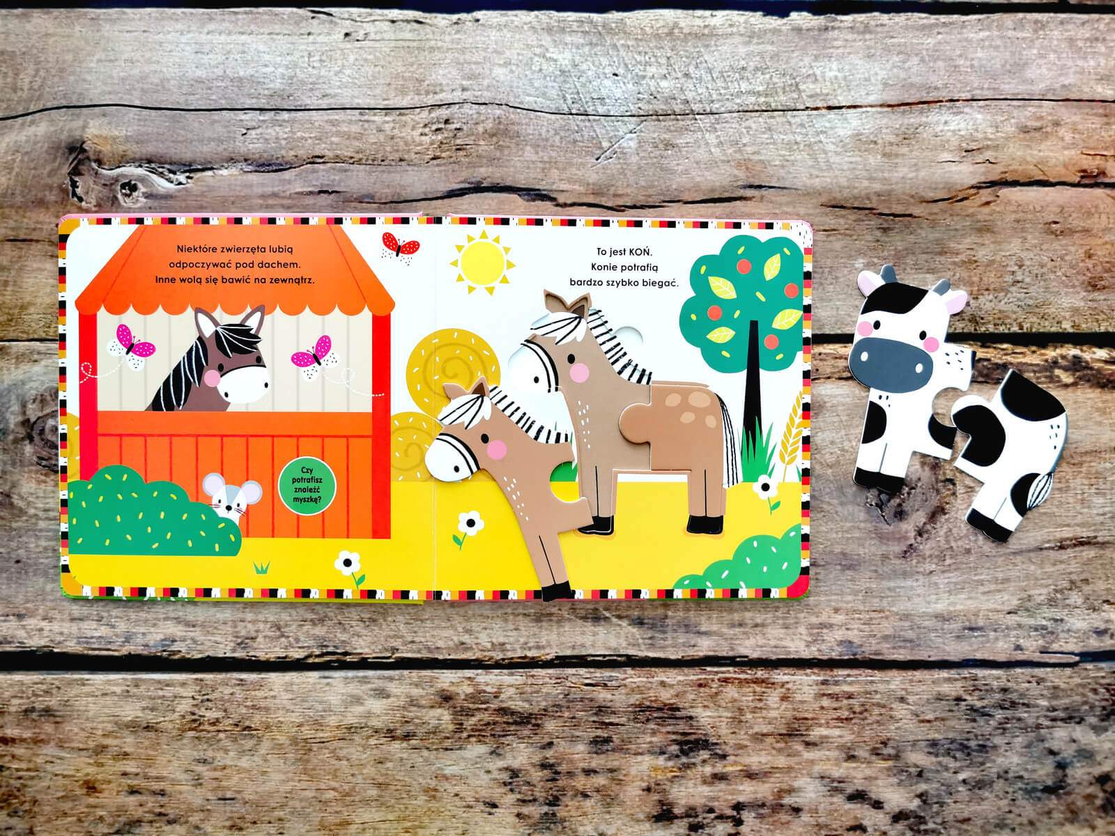 Tytuł Na wsi przedstawia zwierzęta mieszkające w zagrodzie i oborze. Każda strona poświęcona jest jednemu zwierzęciu. Dzięki temu poznajemy: krówkę, konia, owce i kurę. Każde z tych zwierzątek występuje jako puzzel składający się z dwóch elementów. Po wyjęciu i ułożeniu puzzli możemy je rozsypać i próbować układać na nowo. Inną propozycją jest kolorowanie. Ułóż puzzla na kartce i odrysuj krawędzie zwierzątka, następnie wspólnie z dzieckiem pomalujcie je kredkami.