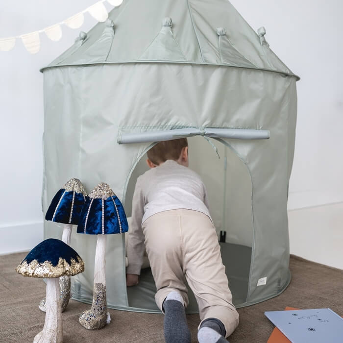 Namiot tworzy przytulne i magiczne otoczenie, które dzieci pokochają. Namiot dla dzieci to także świetny element dekoracyjny pokoju dziecięcego, który doda wnętrzu uroku i charakteru. Siateczkowe okna i drzwi można dowolnie odsłaniać i zasłaniać. Namiot został starannie zaprojektowany, aby zapewnić stabilność i wygodę podczas użytkowania. Posiada solidną ramę, która utrzymuje go w stabilnej pozycji, nawet podczas intensywnej zabawy. Dzięki lekkiej konstrukcji namiot można z łatwością przenosić i rozkładać w różnych miejscach. Namiot został wykonany z poliestru pochodzącego z recyklingu. Materiał ten jest zarówno przyjemny w dotyku, jak i odporny na codzienne zużycie.