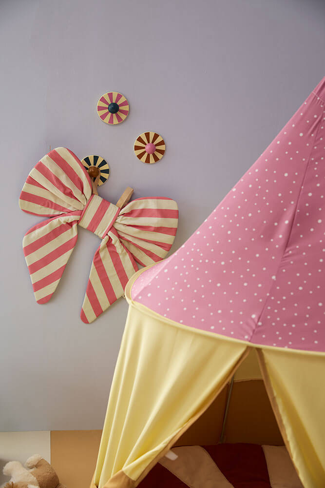 Mimo zabawowego charakteru, kolorystyka została dobrana tak, aby namiot harmonijnie pasował do każdego wnętrza - nie tylko dziecięcego pokoju, ale również salonu. Wykonany z miękkiego w dotyku poliestru w jednolitych, spójnych kolorach, z dachem ozdobionym delikatnym wzorem w kropki, prezentuje się estetycznie i nowocześnie.