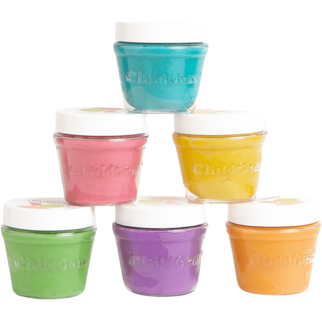 Zestaw zawiera 6 słoiczków lekkiej ciastoliny w pastelowych kolorach: zielony, różowy, żółty, fioletowy, pomarańczowy i niebieski.