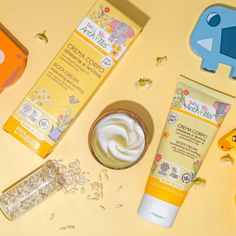 Nawilżająco-łagodzący krem do ciała dla dzieci, z ekologicznym rumiankiem i ryżem, 100 ml