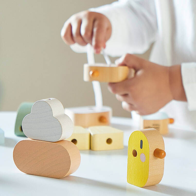 To zabawka, rozwijająca małą motorykę, koordynację ręka-oko, sprawność dłoni i palców oraz skupiająca uwagę dziecka. W zestawie jest długi biały sznurek z laminowanymi końcówkami, na który można nawlekać drewniane elementy w różnych kształtach. Tych jest łącznie 21, w czym 4 to tułowia ptaszków, pozostałe zaś mogą tworzyć np. skrzydła, gniazdka, drzewa czy chmurki. Zabawka została zaprojektowana we Francji. Zapakowana jest w estetyczne kartonowe pudełko. Idealnie nadaje się na prezent.