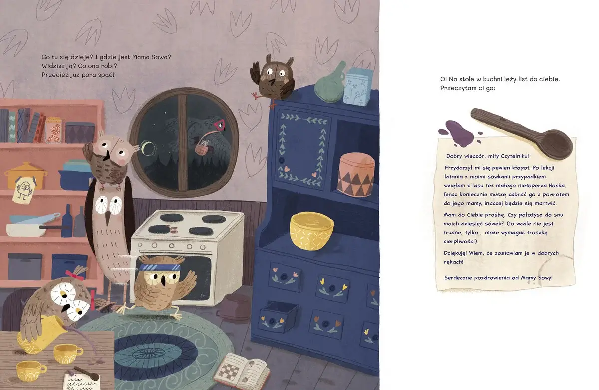 Tego dnia Mama Sowa ćwiczyła ze swoimi 10 sówkami sztukę latania w sosnowym lesie. Kiedy wieczorem wszystkie wróciły do dziupli... okazało się, że jest o jedno dziecko za dużo. Rozkojarzona Mama Sowa przypadkiem wzięła ze sobą małego nietoperza i teraz musi go szybko zabrać do jego domu! A przecież nadeszła już pora snu. Kto położy jej sówki do łóżek?