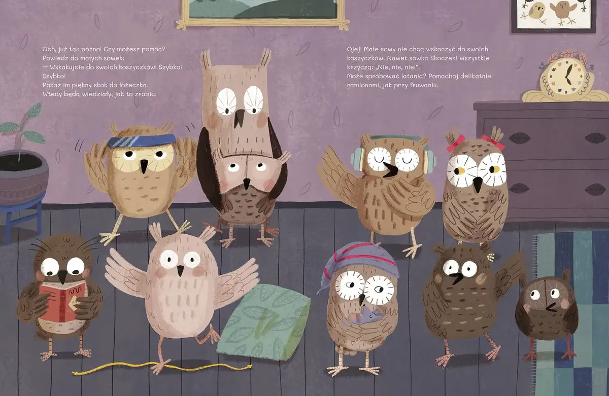 Mały czytelnik wciela się w rolę rodzica i jest zachęcany do udziału w zabawie. Aktywnie pomaga położyć 10 małych sówek do snu, szukając przytulanki, myjąc zęby, śpiewając kołysankę i wykonując inne wieczorne rytuały.
