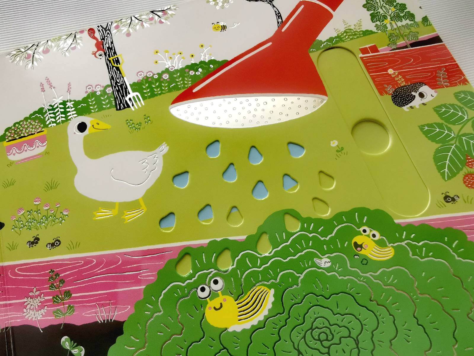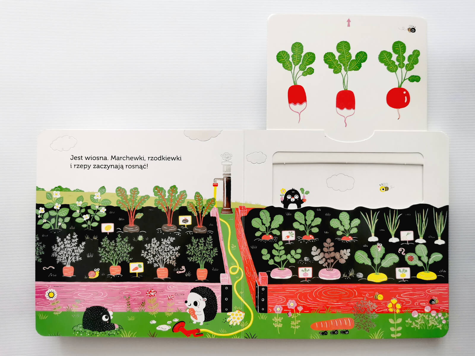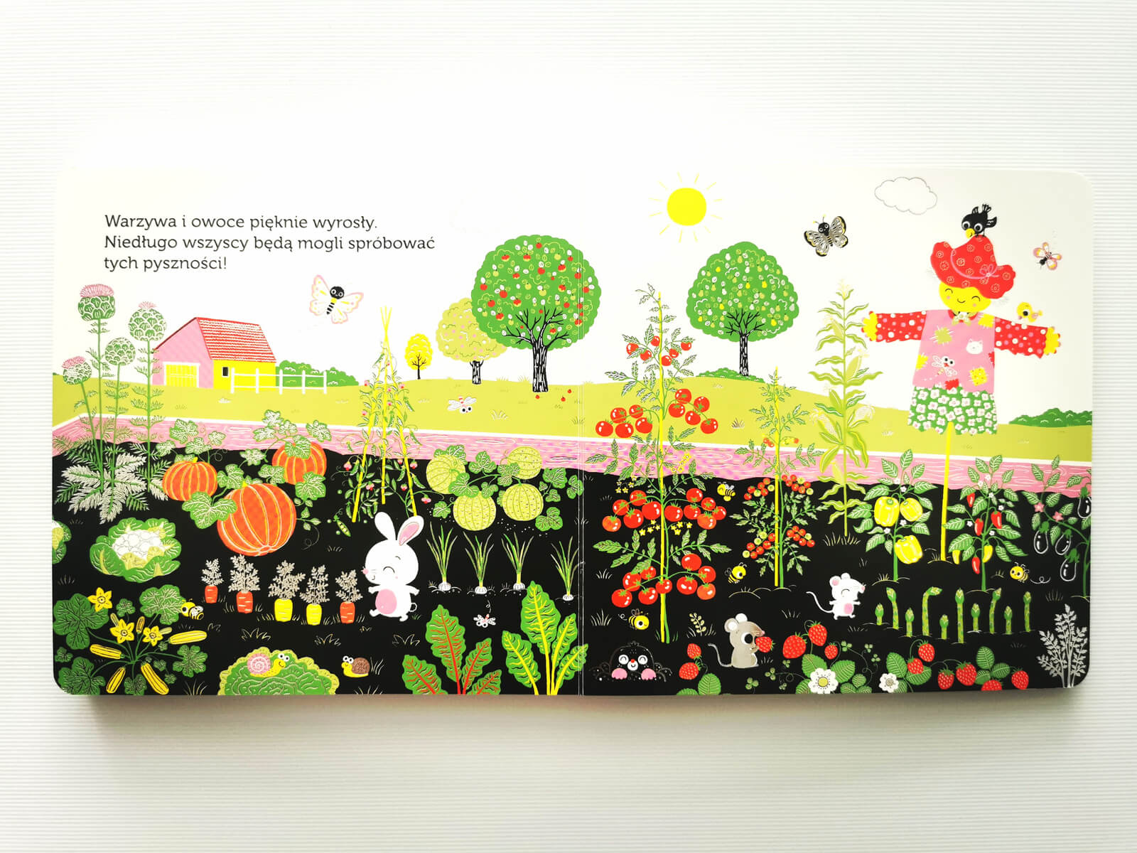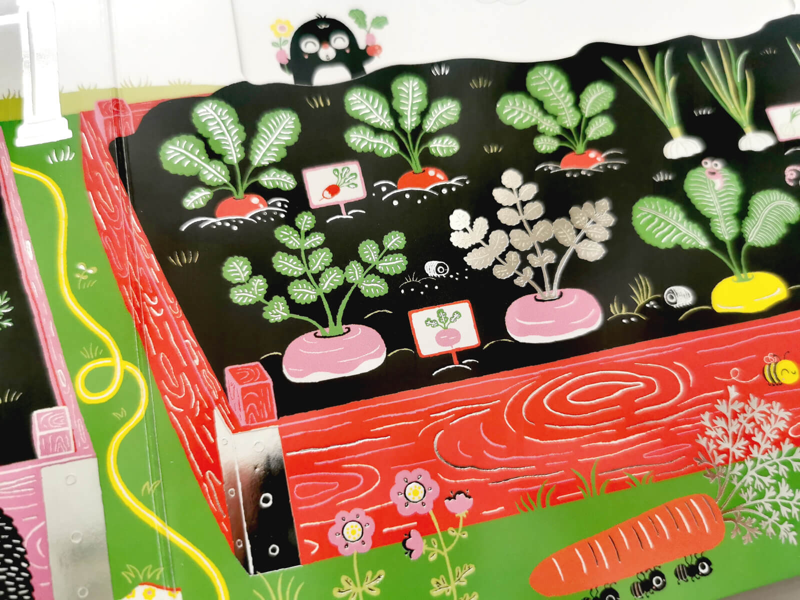 Ogródek Warzywny z serii Niesamowity spacer to książeczka dla najmłodszych z ruchomymi elementami oraz srebrnymi tłoczeniami
