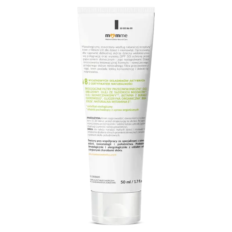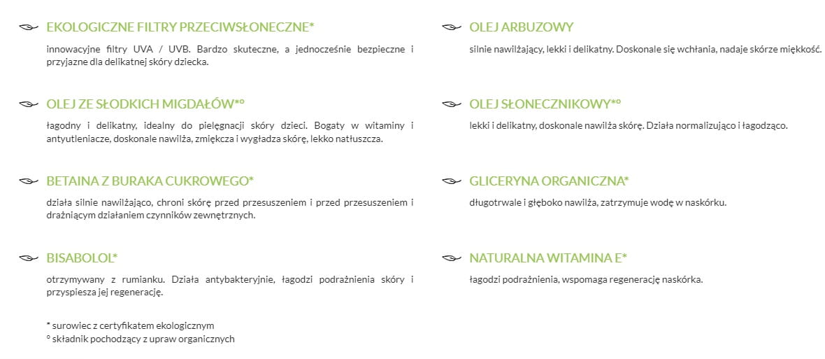 Opracowany, aby zapewnić delikatnej skórze dziecka wielokierunkową pielęgnację oraz ochronę przed promieniowaniem słonecznym i jego negatywnymi następstwami. Zawiera certyfikowane, ekologiczne filtry nowej generacji, które zapewniają wysoką protekcję UVA i UVB oraz minimalizują ryzyko reakcji alergicznych, związanych z ekspozycją na słońce. Silnie nawilżająca betaina z buraka cukrowego i olej ze słodkich migdałów, wzmacniają naturalną barierę ochronną skóry. Łagodny olej arbuzowy oraz gliceryna organiczna zapewniają natychmiastowe ukojenie i utrzymują optymalną ilość wody w naskórku. Naturalna witamina E i otrzymywany z rumianku bisabolol działają kojąco i wspomagają regenerację podrażnionej skóry, a nowoczesna formuła filtra sprawia, że krem łatwo się rozprowadza i nie powoduje obciążenia skóry.