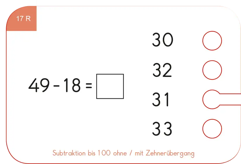 Zestaw zawiera 48 starannie dopasowanych zadań z odejmowania w zakresie 100, na 24 kartach. Karty wspierają naukę odejmowania, rozwijają pamięć, logiczne myślenie i koncentrację, ćwiczą motorykę małą dzięki pracy z drewnianym patyczkiem dołączonym do drewnianego pudełka WiemTo.