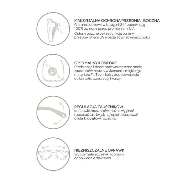 Antypoślizgowe, zakrzywione ramiona nie uciskają głowy dziecka, są dobrze dopasowane i pozostają na miejscu, także podczas typowych dziecięcych aktywności. Profilowanie strefy nosa nawiązuje do stylu vintage, jest uniwersalne i wyjątkowo stabilne, a ponadto wraz ze strefą skroni wykonane zostało w technologii Fit z elastycznego, trwałego tworzywa, które dopasowuje się do kształtu twarzy. Szczególny, obły kształt rozbudowanych oprawek zabezpiecza oczy malucha przed promieniami słonecznymi wpadającymi również z boku. Specjalne, nietłukące się „szkiełka” w kolorze ciemnobrązowym to soczewki kategorii 3, która gwarantuje maksymalną, 100% ochronę przed promieniami UV. Nadają się do ekspozycji na słońce również na plaży czy w górach. Okulary posiadają regulowane zauszniki 360° oraz elastyczną opaskę, którą można w razie potrzeby zamocować na klik (dzięki silikonowym zaczepom) dla optymalnego komfortu.