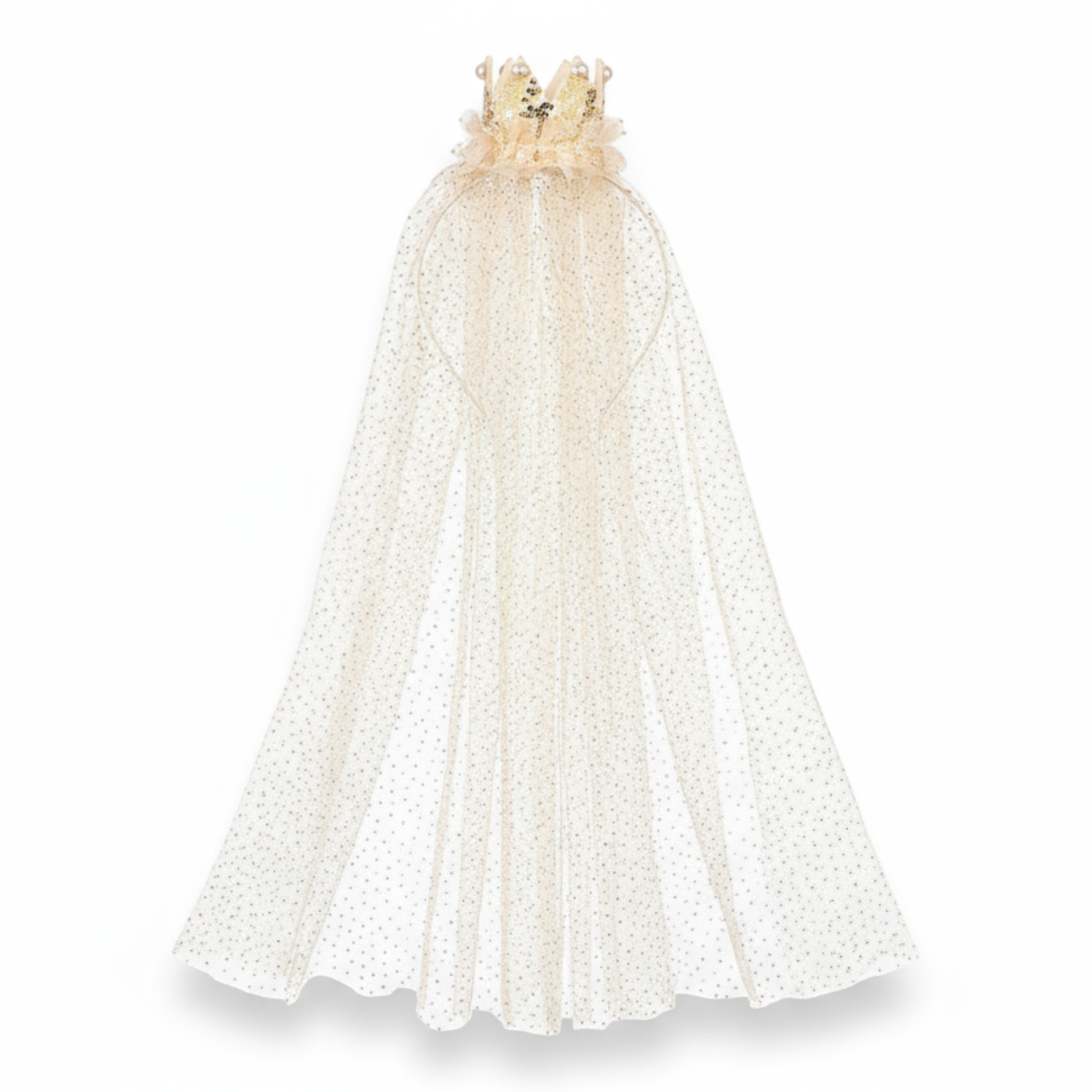 Jest owinięta jasną wstążką. Zdobi ją długi tiulowy welon w złoty print, a u góry trójwymiarowa złota korona z tiulowym upięciem, cekinami i perełkami. Jest lekka, delikatna i przyjemna w noszeniu (ma optymalną szerokość – 0,5 cm – i nie uciska). Idealna na przyjęcia i jako uzupełnienie przebrania księżniczki. Sprawdzi się także jako stylowy prezent.