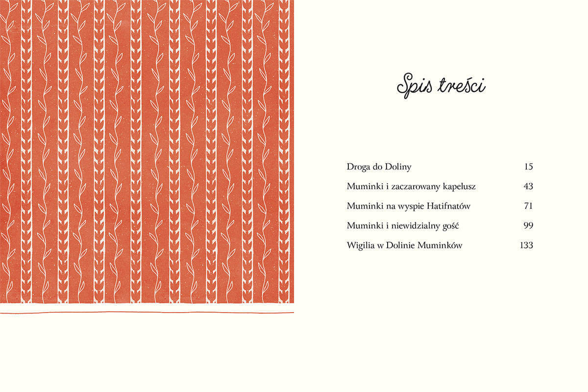 Przepiękne, kolorowe ilustracje są inspirowane grafikami fińskiej autorki. W książce znajdują się następujące opowiadania: Droga do Doliny, Muminki i zaczarowany kapelusz, Muminki na wyspie Hatifnatów, Muminki i niewidzialny gość, Wigilia w Dolinie Muminków.