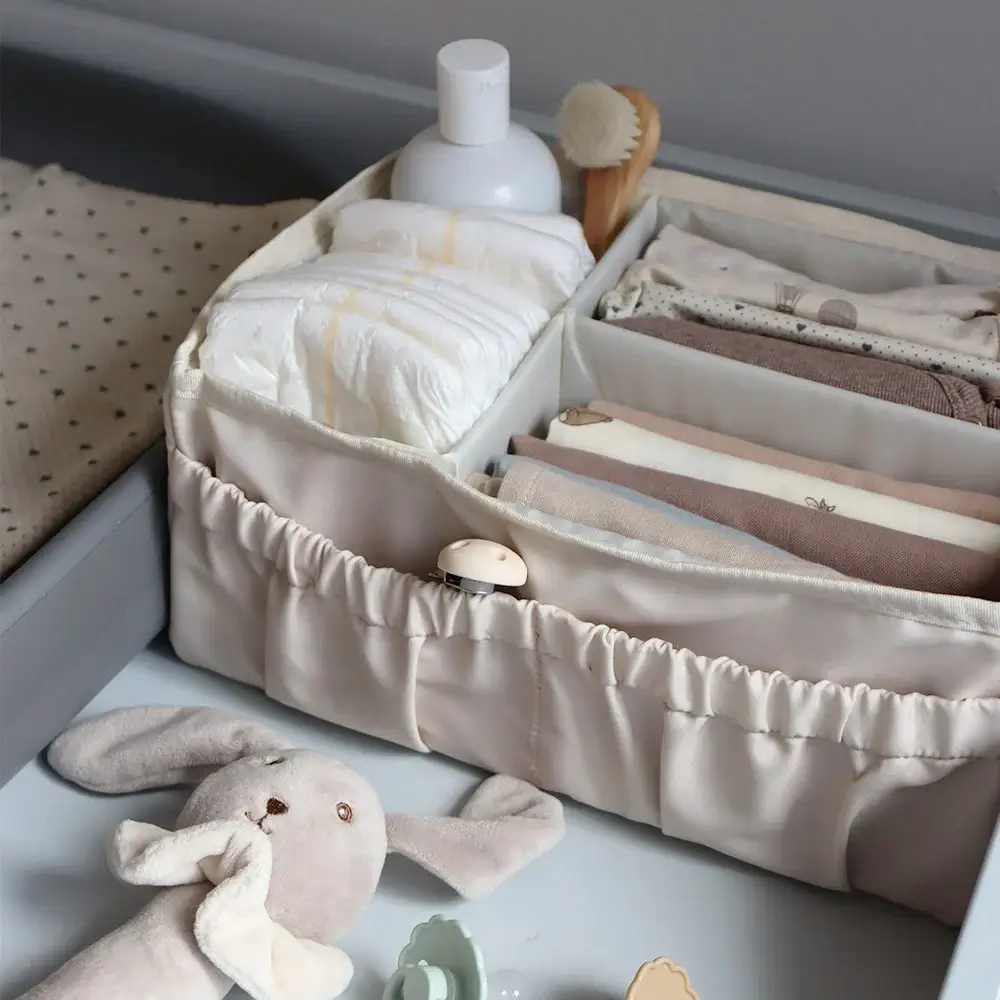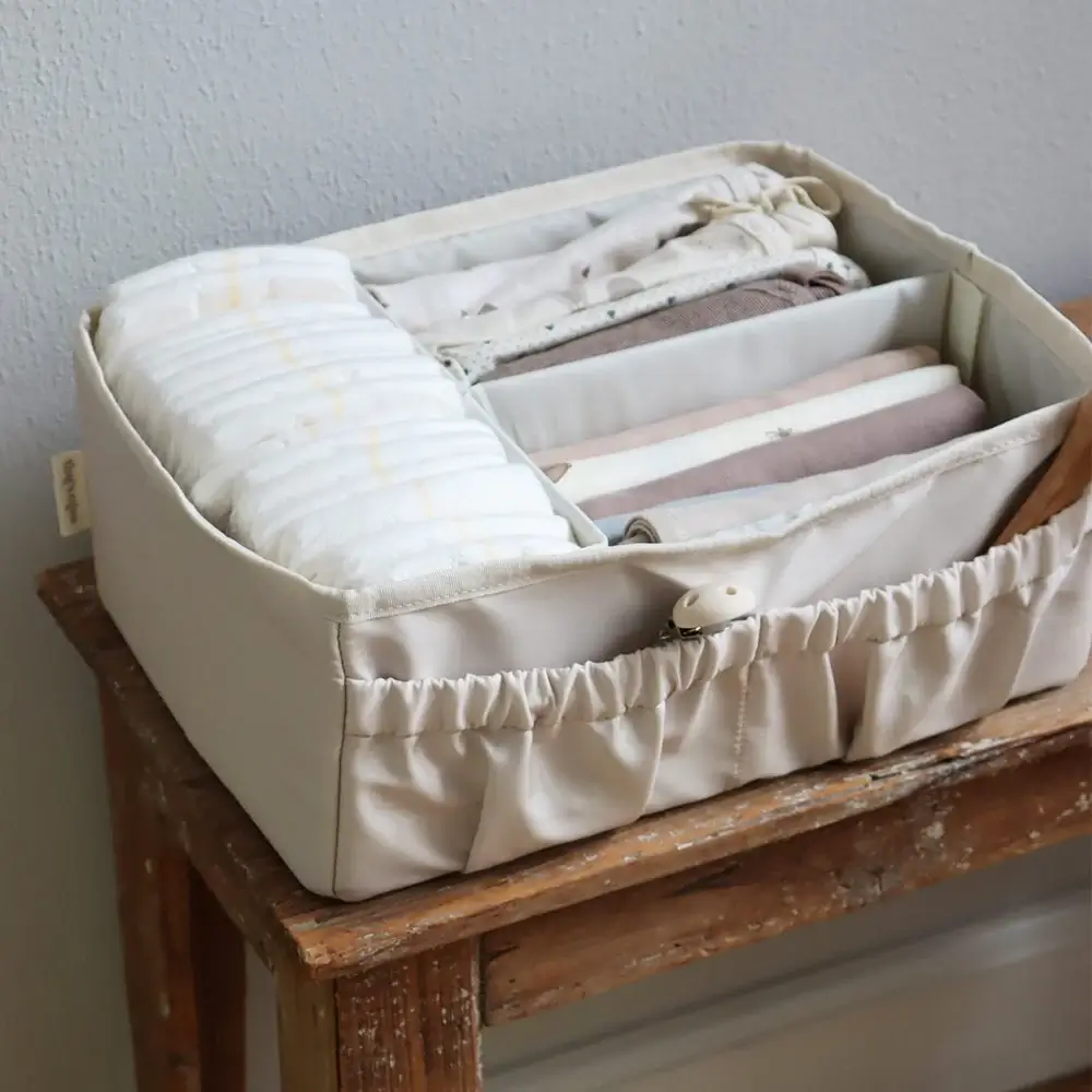 Zadbaj o porządek w kąciku do przewijania dzięki temu funkcjonalnemu pudełku do przechowywania. To idealne miejsce na pieluszki, kremy, chusteczki, pieluszki tetrowe i wszystkie inne niezbędne akcesoria, które chcesz mieć zawsze pod ręką.