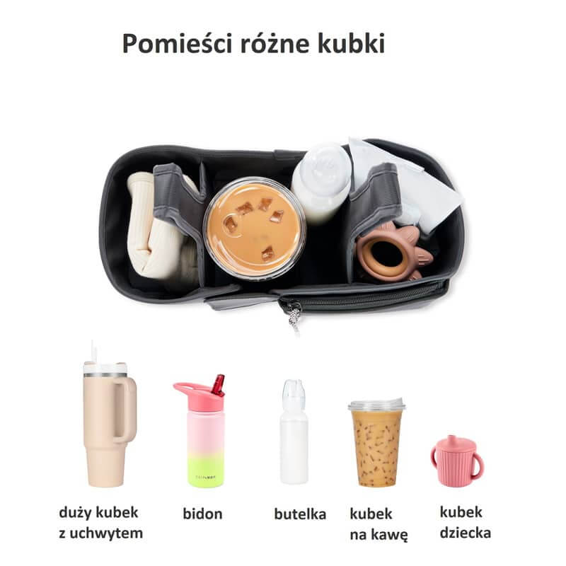 - 3 wewnętrzne przegrody: Idealne do przechowywania butelek dla dziecka, kubków niekapków, Twojej kawy czy bidonów, dbając o to, by wszystko było w zasięgu ręki i w pionie.