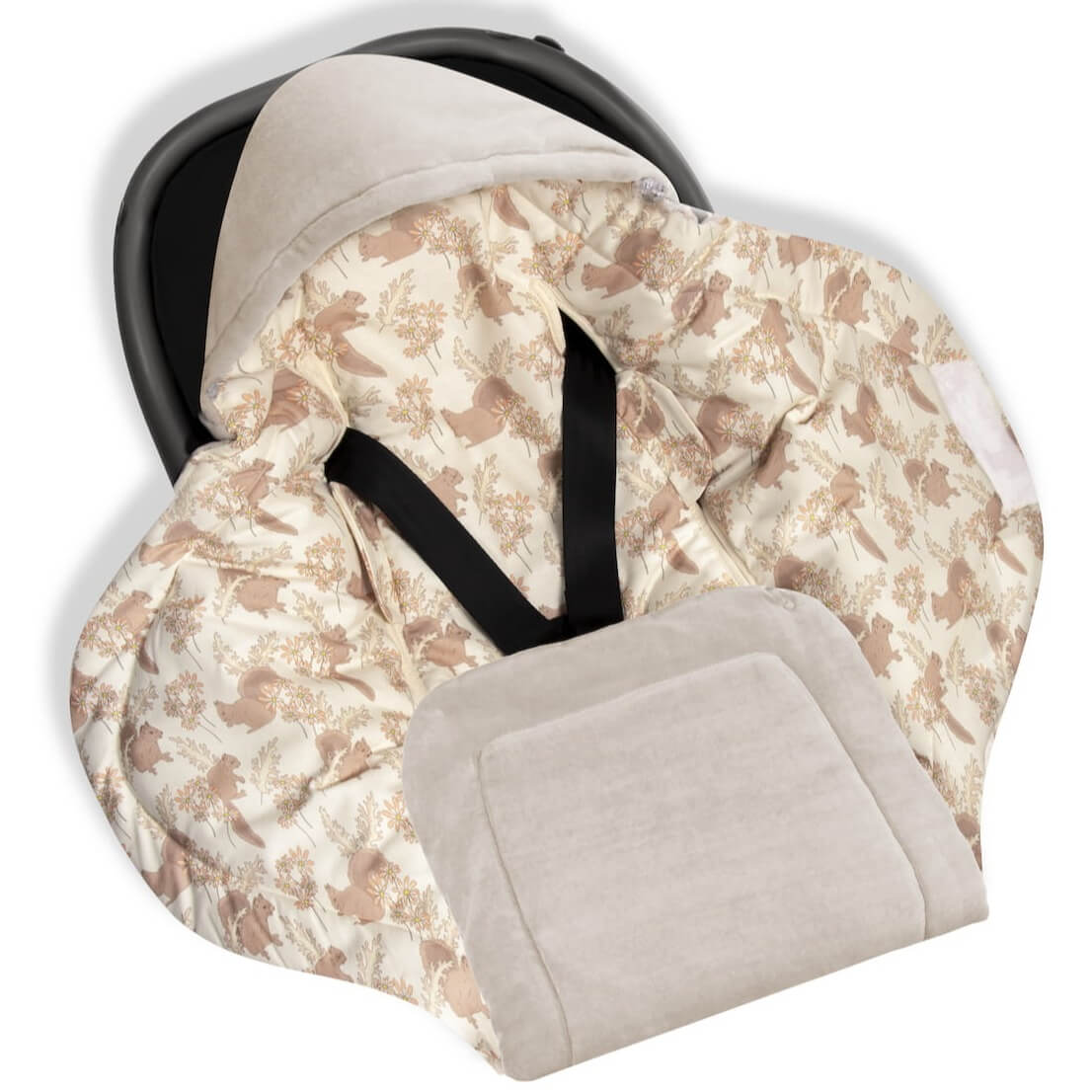 Teraz wystarczy, że kocyk będzie włożony do nosidełka samochodowego. Gdy wychodzisz na zewnątrz: zaciągnij kapturek elastycznymi sznureczkami, dół podepnij napami tak, aby dziecko się nie rozkopywało i otul je, zapinając boki rzepami. Wewnątrz samochodu lub pomieszczenia wystarczy rozpiąć otulacz, aby uniknąć przegrzania maluszka.