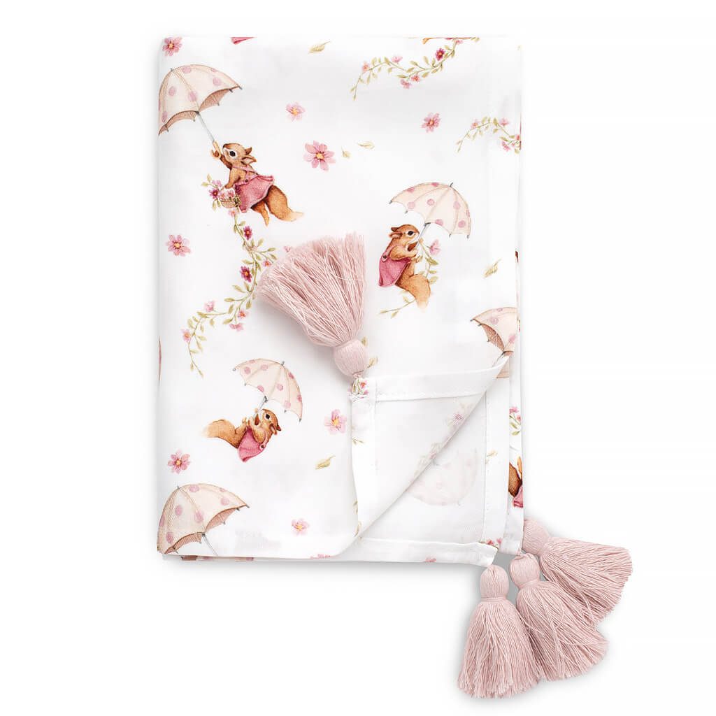 Miękki otulacz bambusowy z uroczymi chwościkami okryje i otuli maluszka już od pierwszych dni życia