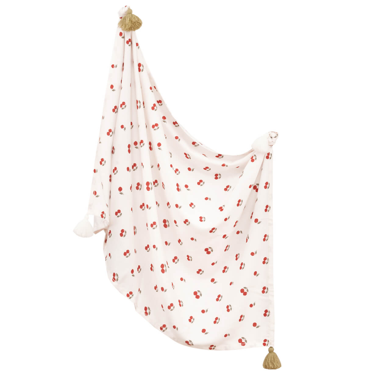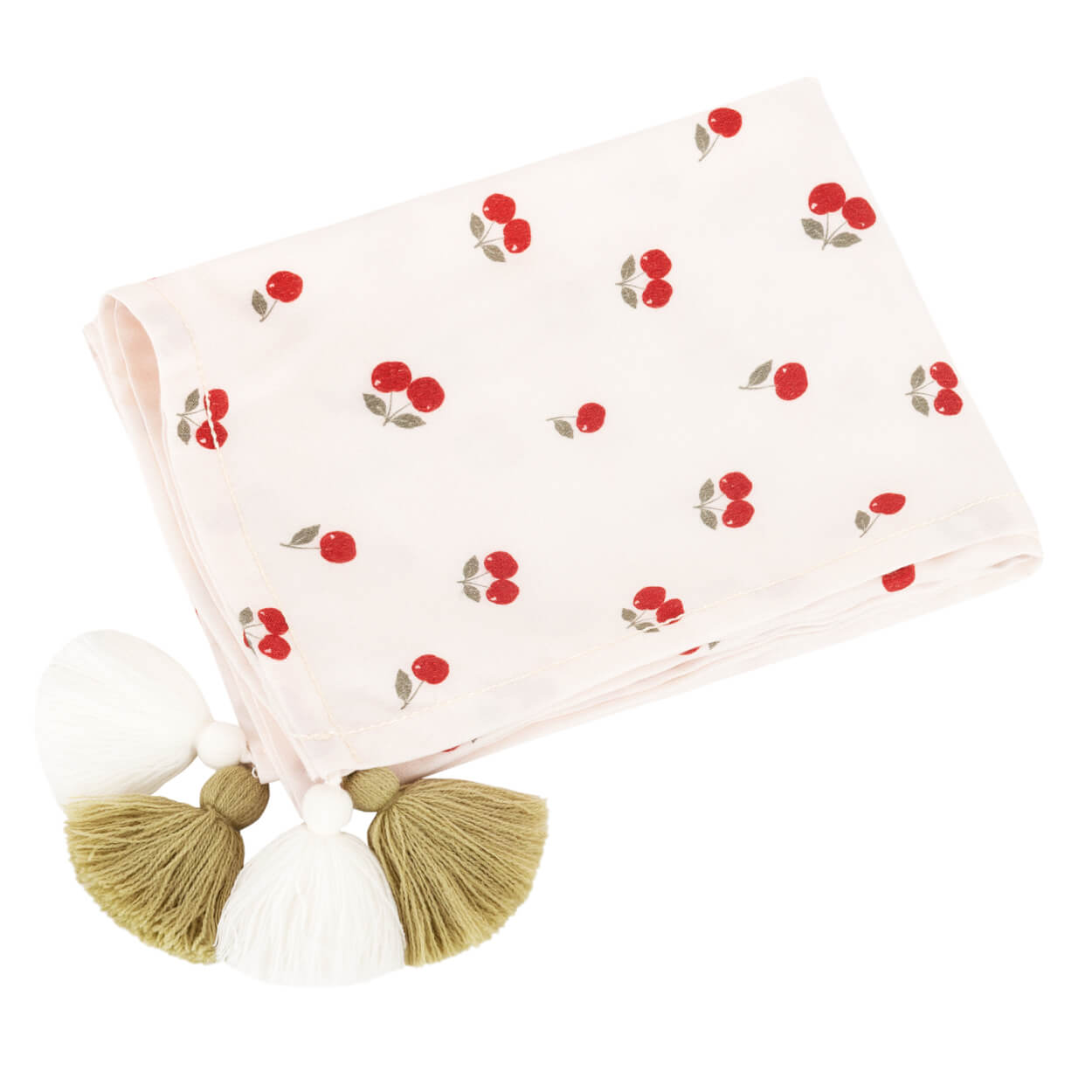 Otulacz lekki kocyk bambusowy Wisienki z frędzlami 120x100 cm