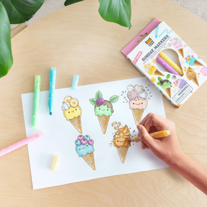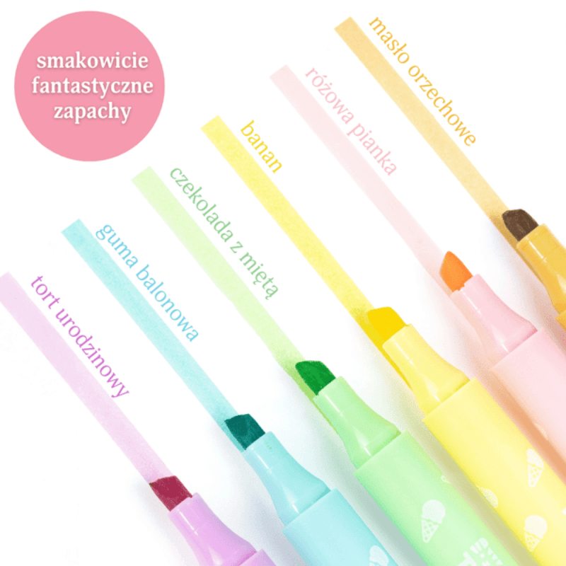 Zaserwuj swojemu dziecku porcję kreatywności z tym zestawem sześciu pachnących flamastrów z motywami lodowych deserów! Każdy flamaster ze ściętą końcówką dodaje pracom magię kolorów oraz piękny, smakowity zapach – od czekolady z miętą po masło orzechowe i gumę balonową. Te nietoksyczne, zmywalne flamastry sprawiają, że proces tworzenia pachnie tak słodko, jak wyglądają gotowe dzieła, co czyni każdą chwilę z nimi wyjątkową przygodą dla zmysłów.