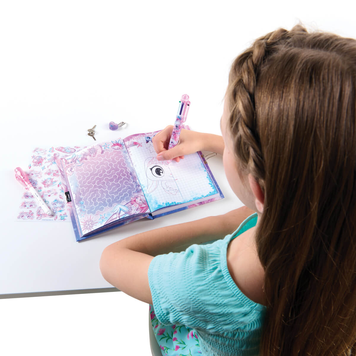 - Dodatki w zestawie – długopis w 6 kolorach i arkusze z naklejkami do ozdabiania stron.