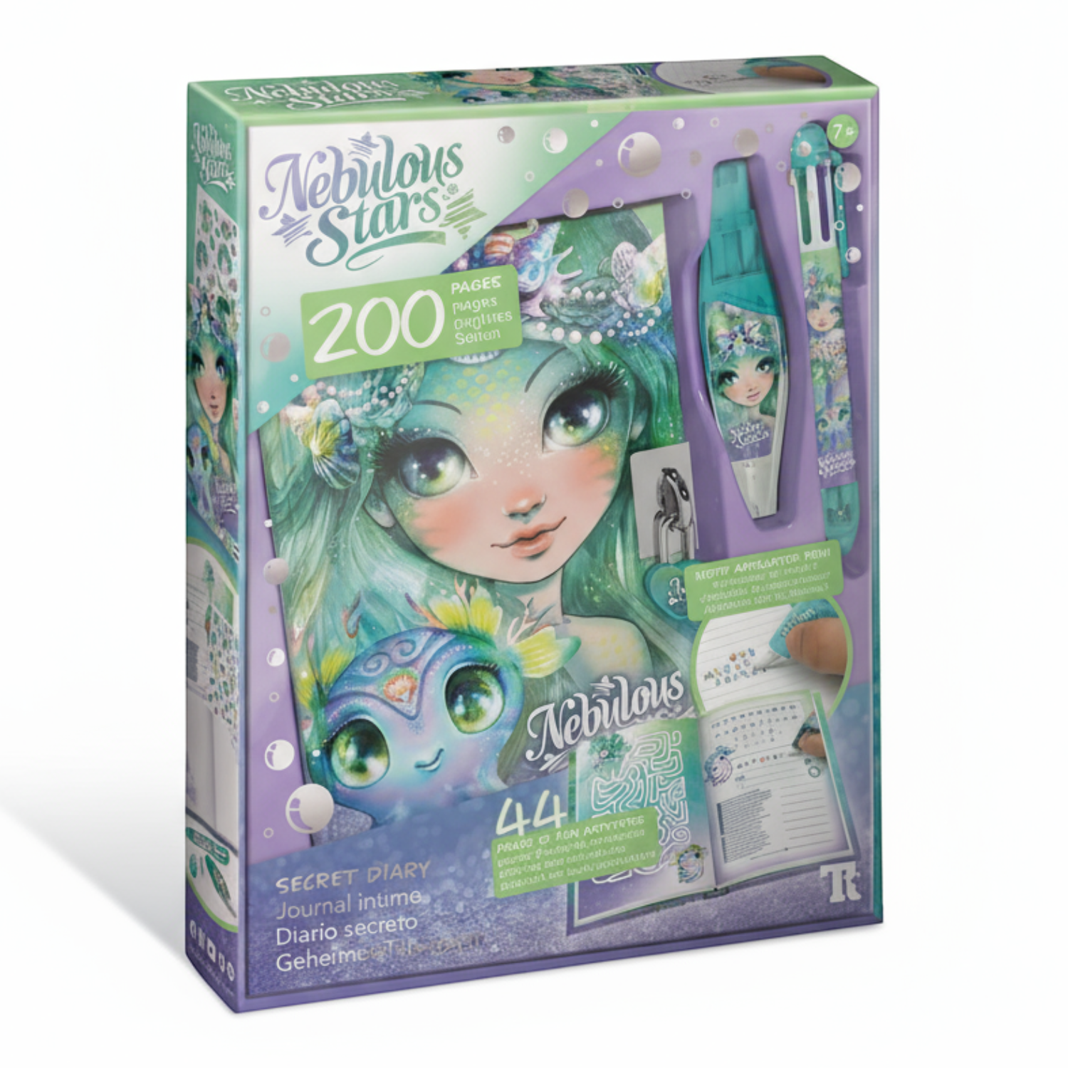 Nie chcesz się nimi dzielić ze światem – nic prostszego! Dzięki zamknięciu na kłódkę nikt nie pozna Twoich tajemnic. Ucz się ubierać w słowa swoje uczucia, spisuj cytaty z bajek, które Cię poruszyły, ale też uchwyć chwile z Twojej codzienności. Zeszyt ma piękną, kolorową okładkę z Marinią z krainy Nebulous, a także specjalny aplikator do wzorów, długopis w sześciu kolorach i naklejki.