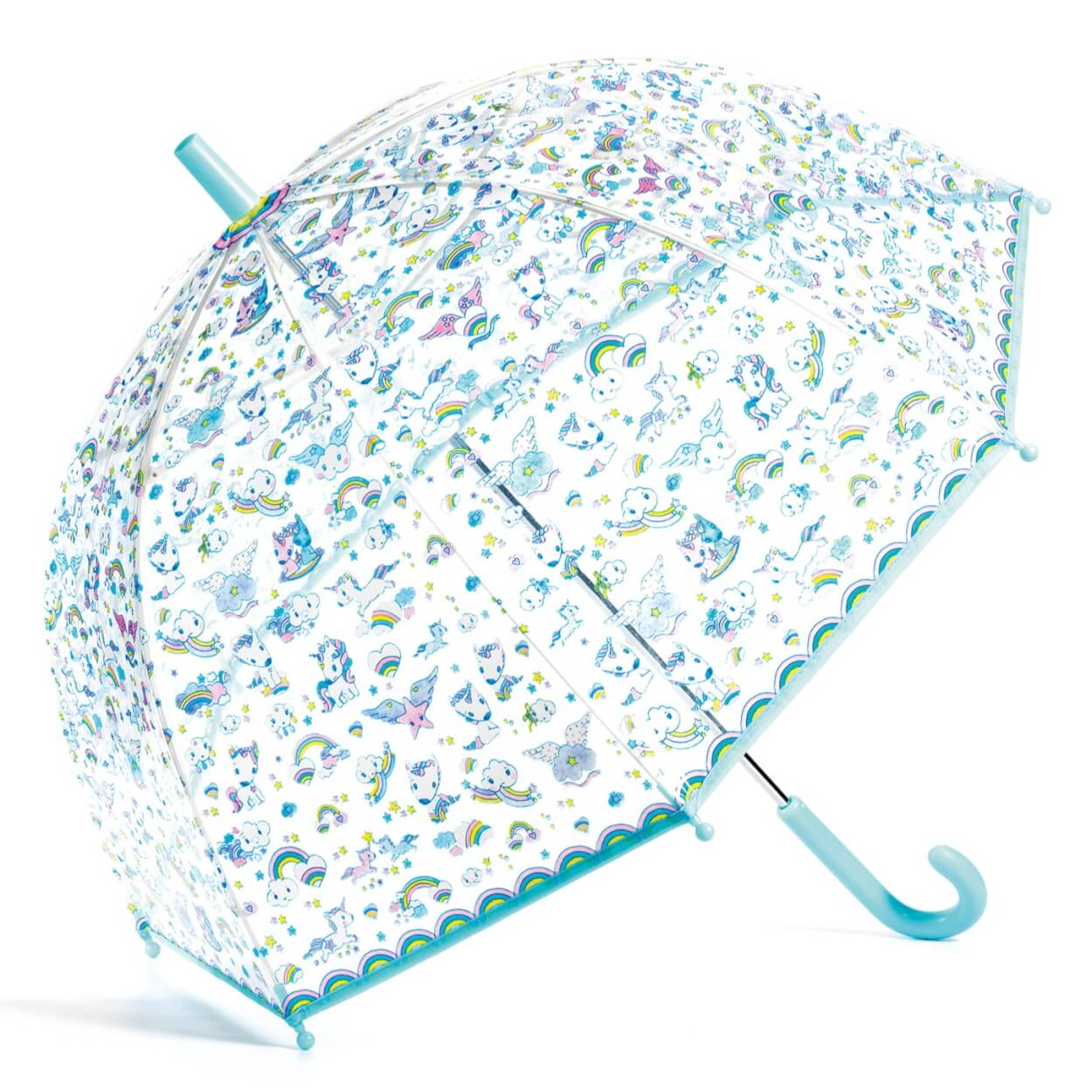 Przezroczysty plastikowy parasol od Djeco chroni przed deszczem i pozwala zobaczyć, dokąd zmierzasz.