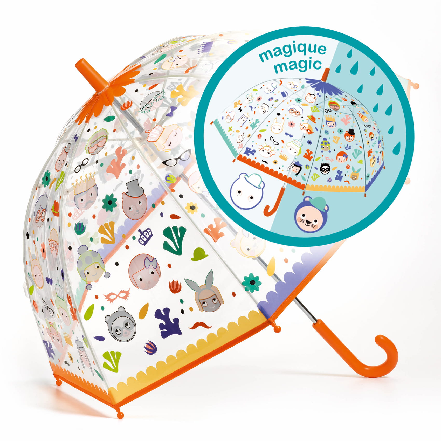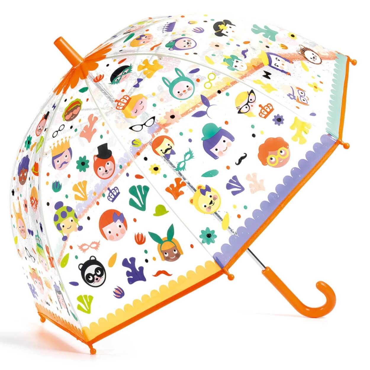 Przezroczysty plastikowy parasol od Djeco chroni przed deszczem i pozwala zobaczyć, dokąd zmierzasz.