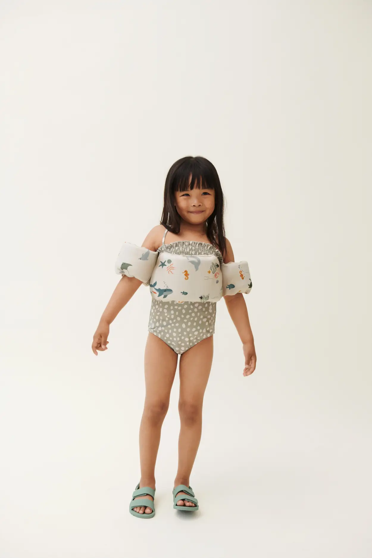 Lekki pas do pływania i dołączone opaski na ramię jako jeden element, Darko przeznaczony jest dla małych dzieci uczących się pływać i utrzymywać się na powierzchni wody. Dodatkowa wyporność pomaga utrzymać je w pozycji pionowej i poziomej, ułatwiając naukę pierwszych kroków pływania.