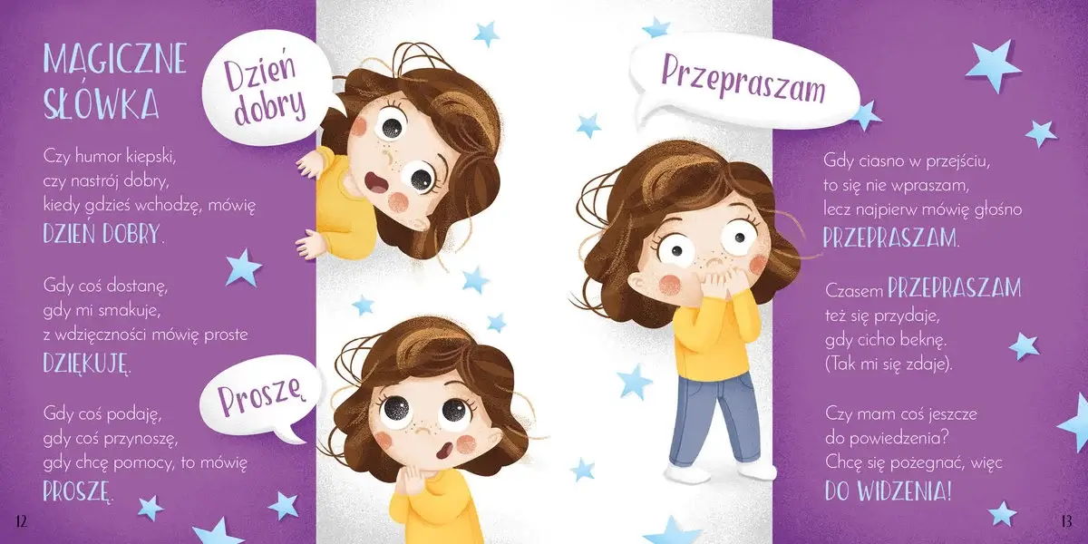 W książce maluchy znajdą proste, rymowane wierszyki odnoszące się do różnych, codziennych sytuacji, takich jak ubieranie się czy używanie zwrotów grzecznościowych.