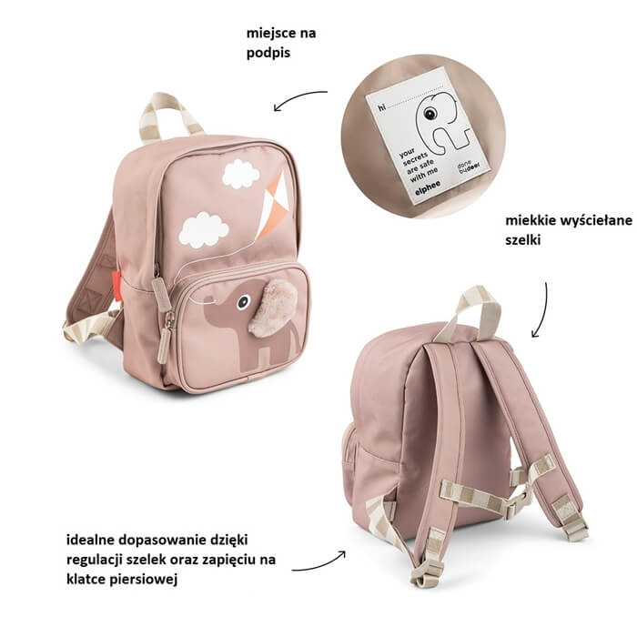 Posiada regulowane miękkie szelki oraz odpinany pasek na mostek. Przestronna komora główna jest idealna do noszenia lunchboxa i bidonu, a przednia kieszeń jest świetnie sprawdzi się na drobiazgi i różne skarby. Słonik Elphee będzie mieć oko na rzeczy Twojego dziecka dzięki możliwości podpisania na uroczej etykiecie w środku.