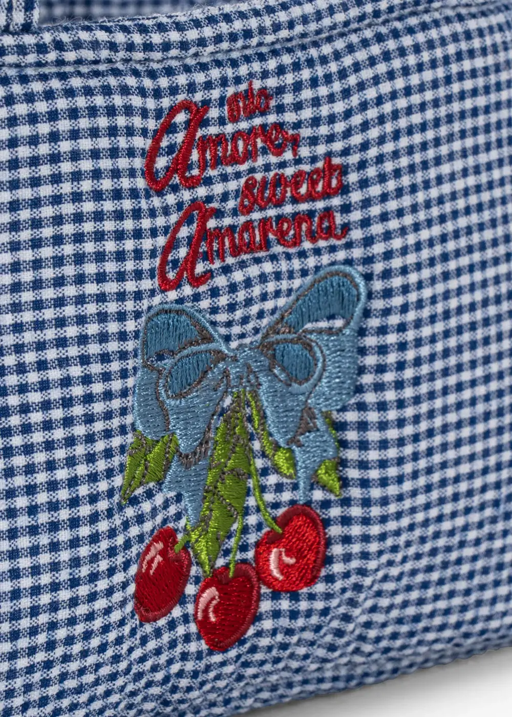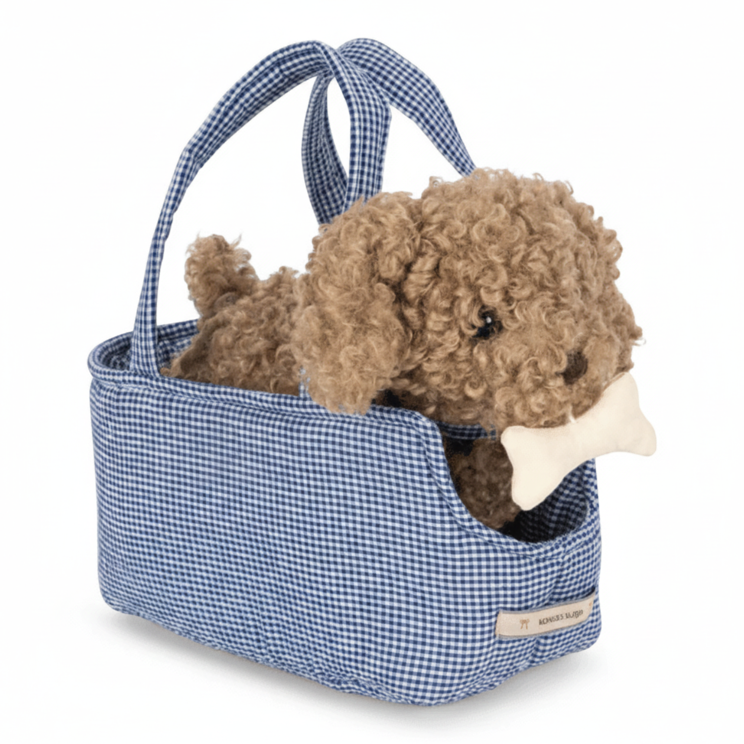 Może towarzyszyć Ci wszędzie. Lulu ma własny, mały koszyczek w kratkę, który jest wyściełany i miękki, żeby mógł w nim wygodnie leżeć.