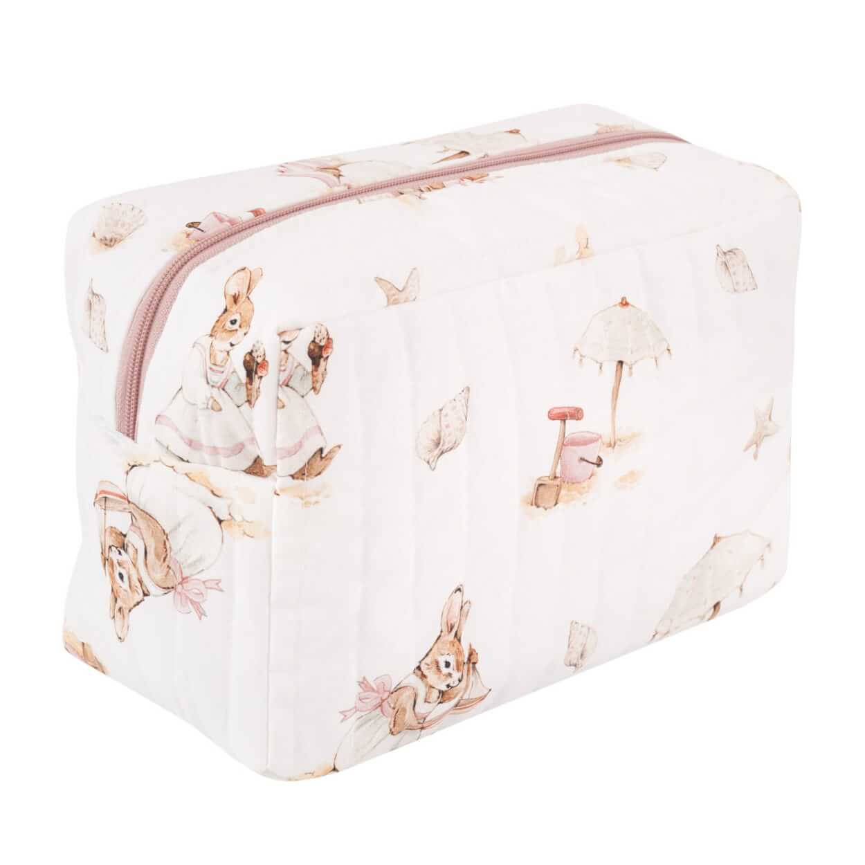 Kosmetyczka zapinana jest na zamek i ozdobiona kolorowym pomponem lub chwostem. Została wykonana z dwóch tkanin. Z zewnętrznej strony została wykonana z pikowanej bawełny satynowej, podwójnie zmiękczonej. Jest to tkanina w 100% wykonana z bawełny. Satynowy splot sprawia, że jest ona delikatna i gładka w dotyku. Wnętrze kosmetyczki to specjalna, wodoodporna tkanina powleczona powłoką hydrofobową, dzięki czemu nic się nie wchłania i łatwo się czyści, dodatkowo jest bardzo lekka.