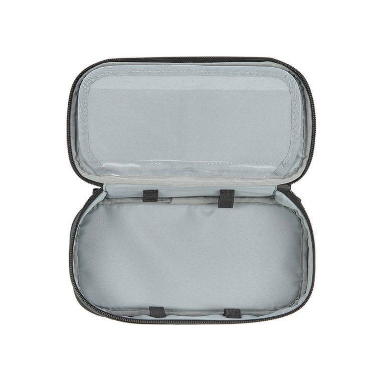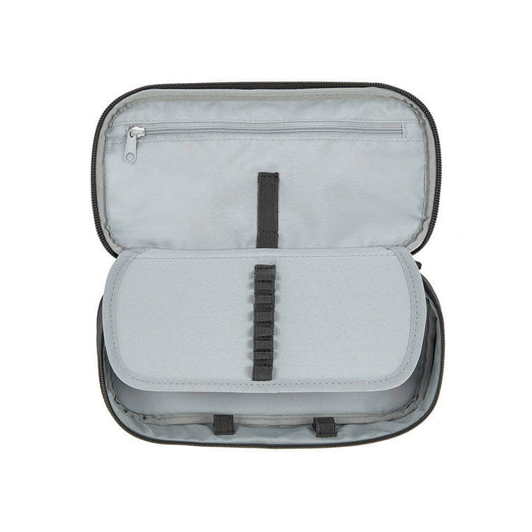 Zapinany na suwak. Ma sporą komorę główną, małą kieszonkę na suwak i szeroką gumę po wewnętrznej stronie klapki, 4 gumki po bokach w dolnej części komory, a także ruchomą przegródkę z 8 gumkami po jednej stronie (są idealne na ołówki lub kredki) i foliową kieszonką po drugiej, np. na plan lekcji lub tabliczkę mnożenia. Piórnik wyróżnia głęboki czarny kolor i solidny, trwały materiał, który łatwo się czyści i jest odporny na wilgoć.
