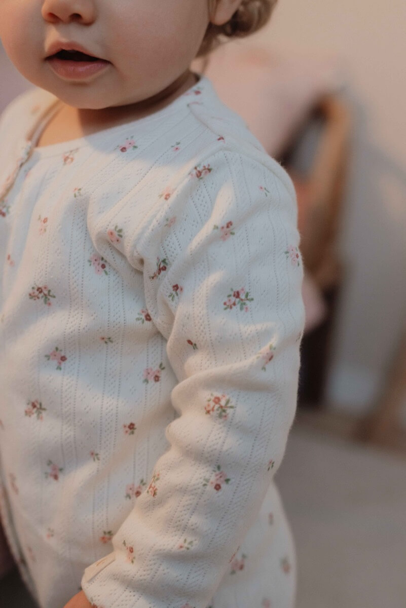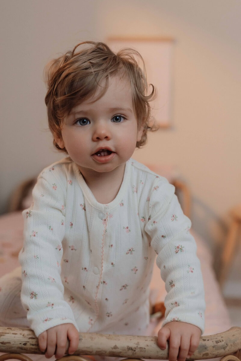 Wykonana z bawełny organicznej, piżamka zapewni miękkość i komfort dla skóry dziecka podczas snu. Zapięcie na zatrzaski z przodu i w kroku ułatwi przebieranie i zmianę pieluchy. Delikatna dzianina bawełniana pointelle z wzorem małych kwiatków dodaje uroku. Zapakowana w piękne pudełko, idealnie nadaje się na prezent.