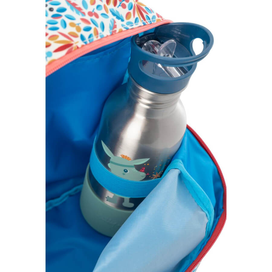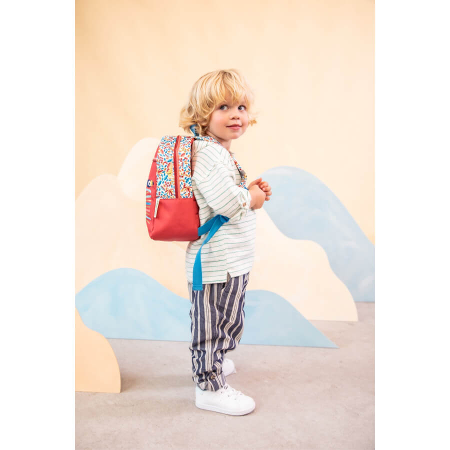 Funkcjonalny, lekki i wygodny, idealny do przedszkola czy na małe wycieczki, pomieści wszystkie niezbędne drobiazgi. Ma zapinaną na suwak, czerwono-niebieską komorę główną w drobny wzór kolorowych listków oraz mniejszą zapinaną na suwak zewnętrzną kieszonkę z przodu, z pyszczkiem Lwa Jacka. Plecak posiada szelki z regulacją długości. Na klatce piersiowej ma dodatkowy pasek stabilizujący i odciążający plecy, zapinany na łatwy w obsłudze zatrzask, a na górze uchwyt do zawieszenia, np. na haczyku w szatni. Wewnątrz komory głównej znajduje się dodatkowa kieszonka i przegroda na butelkę. Plecak pomieści zeszyty czy książeczki formatu A5. Dodatkowo na szelkach znajduje się element odblaskowy. Plecaczek uszyto z wysokiej jakości materiałów pochodzących z recyklingu, łatwych do czyszczenia i odpornych na wilgoć. Jest perfekcyjnie wykończony, z dbałością o każdy szczegół i w pełni bezpieczny dla dziecka.