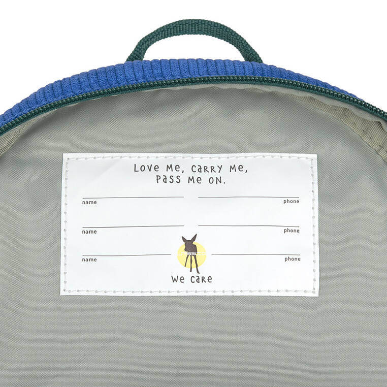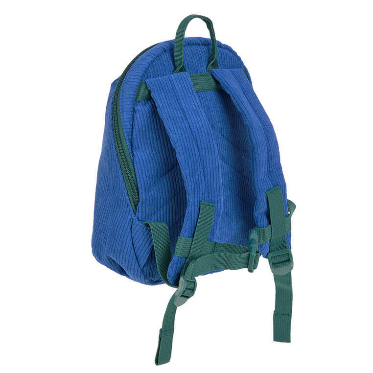 Wykonany jest z niezwykle miękkiego, przyjemnego w dotyku sztruksu cord. Funkcjonalny, lekki i wygodny, idealny do przedszkola i na krótkie wycieczki. Komora główna zapinana jest na suwak, posiada wewnętrzną kieszeń na butelkę z napojem oraz etykietkę z wizytówką, na której można zapisać imię dziecka i numer kontaktowy rodzica. W górnej części znajduje się uszko do zawieszenia plecaka, np. na haczyku w szatni. Dość szerokie, grubsze i miękkie ramiączka zapewniają wygodę noszenia. Na klatce piersiowej dodatkowo wyposażone są z w stabilizujące i odciążające plecy zapięcie na zatrzask – jego wysokość, podobnie jak długość ramiączek, można regulować i na bieżąco dopasowywać do wzrostu dziecka. Plecak ma intensywny niebieski kolor i karmelową, teksturowaną aplikację na przodzie – uśmiechniętą buźkę. Uszko, paski oraz suwak mają kolor zgaszonej zieleni. Materiał plecaka łatwo się czyści i jest odporny na wilgoć. Produkt jest częścią większej kolekcji. Możesz dobrać do niego inny w podobnym kolorze lub z podobnym motywem.