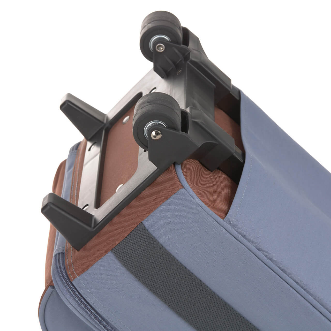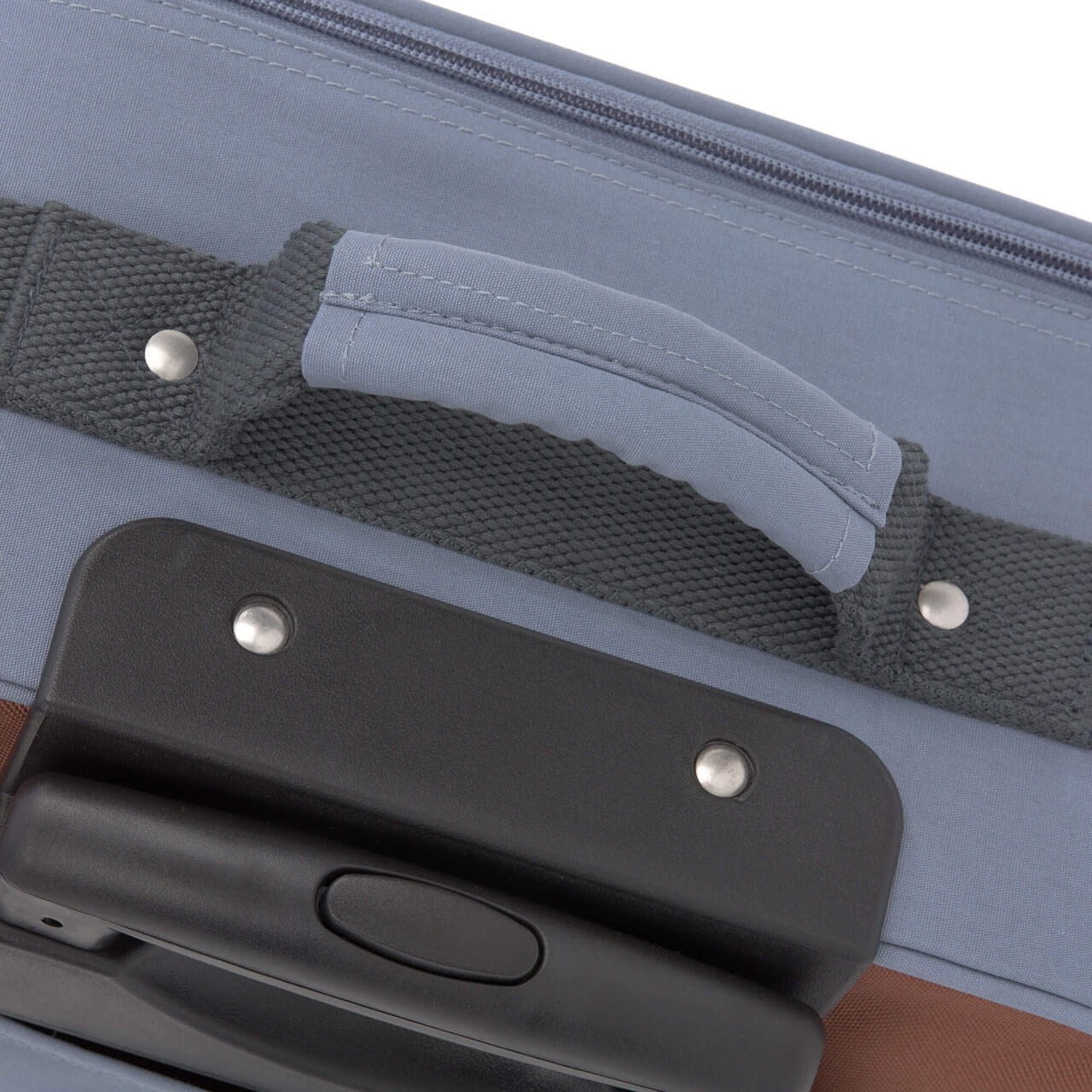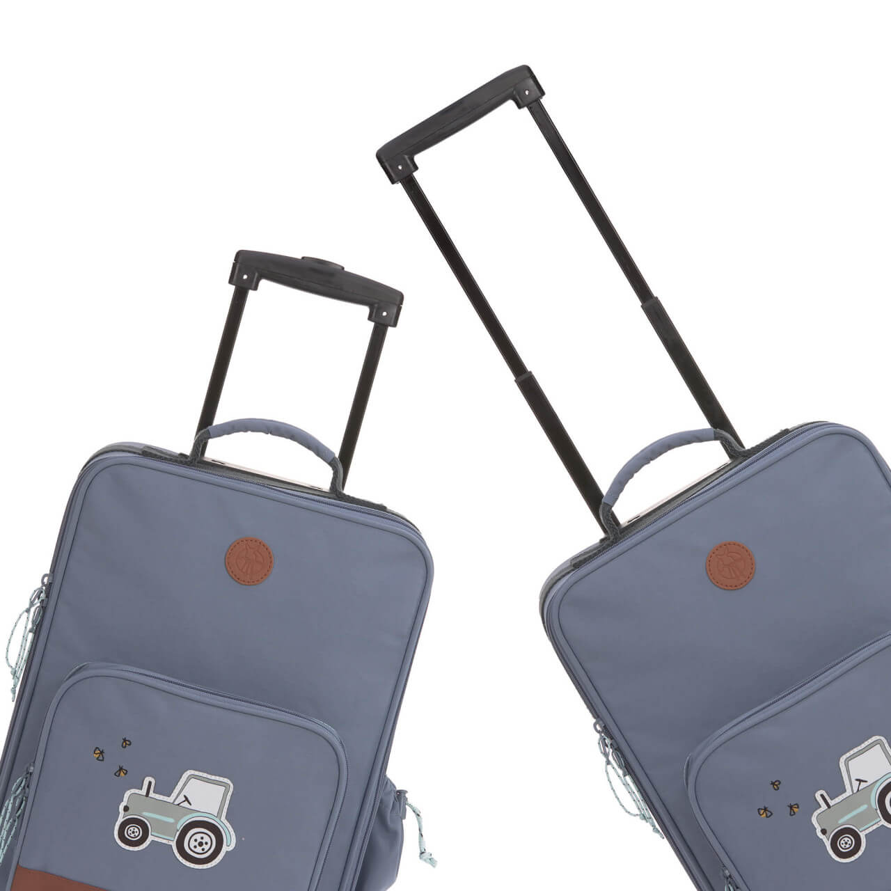Ubrania można łatwo schludnie spakować w głównej komorze i przytrzymać na miejscu dwoma paskami zabezpieczającymi. Buty mają swoje miejsce w praktycznej torbie na buty, która należy do zestawu podróżnego. Na zewnątrz zapinana na zamek przednia komora i boczna kieszeń oferują jeszcze więcej miejsca do przechowywania. Praktyczny teleskopowy uchwyt można regulować w dwóch pozycjach, a mała przezroczysta kieszeń na identyfikator gwarantuje, że nie dojdzie do pomyłki. Wodoodporny materiał zewnętrzny sprawia, że wózek dziecięcy jest fajnym towarzyszem podróży w każdą pogodę.